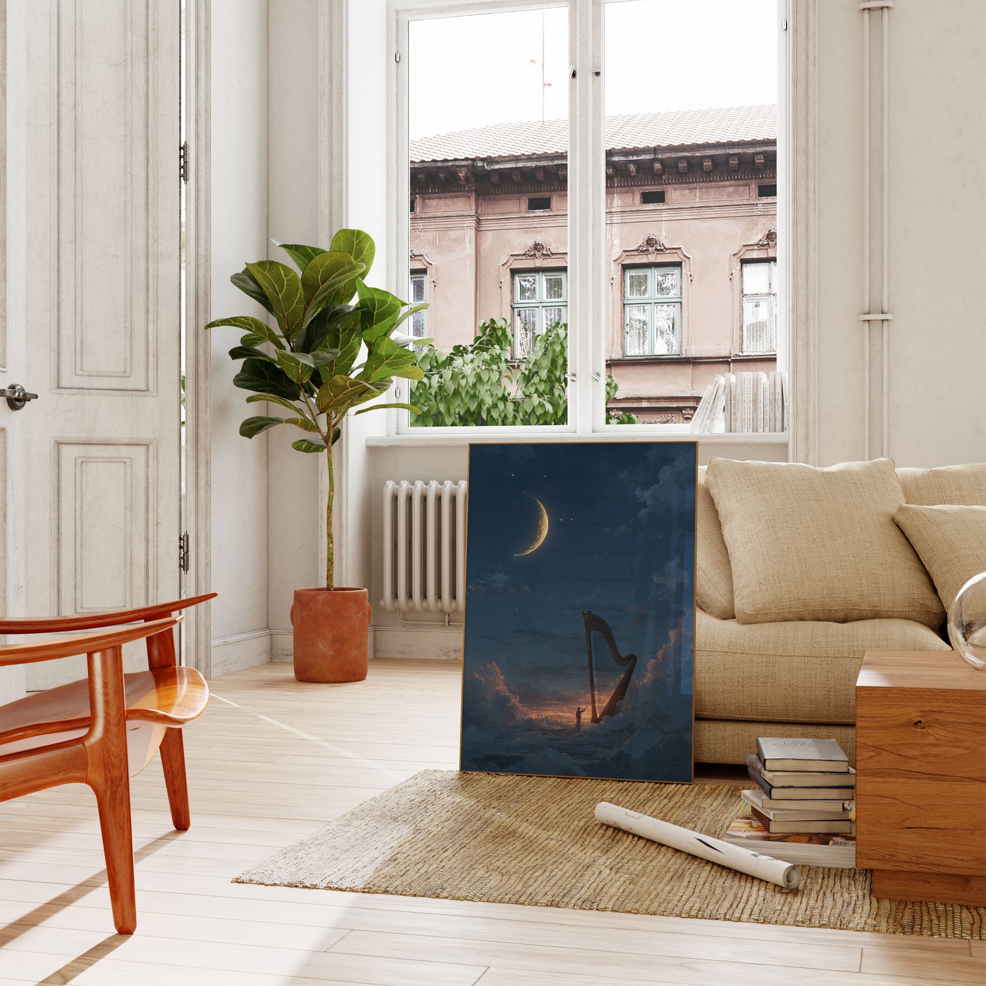 Immerse yourself in a dreamlike nocturnal landscape where a towering harp stands majestically amidst ethereal clouds, beneath a luminous crescent moon. Soft starlight and warm sunset hues create an enchanting atmosphere of musical transcendence, with a solitary figure reaching towards the instrument's elegant silhouette. This mesmerizing artwork captures the sublime intersection of music, celestial wonder, and human imagination.