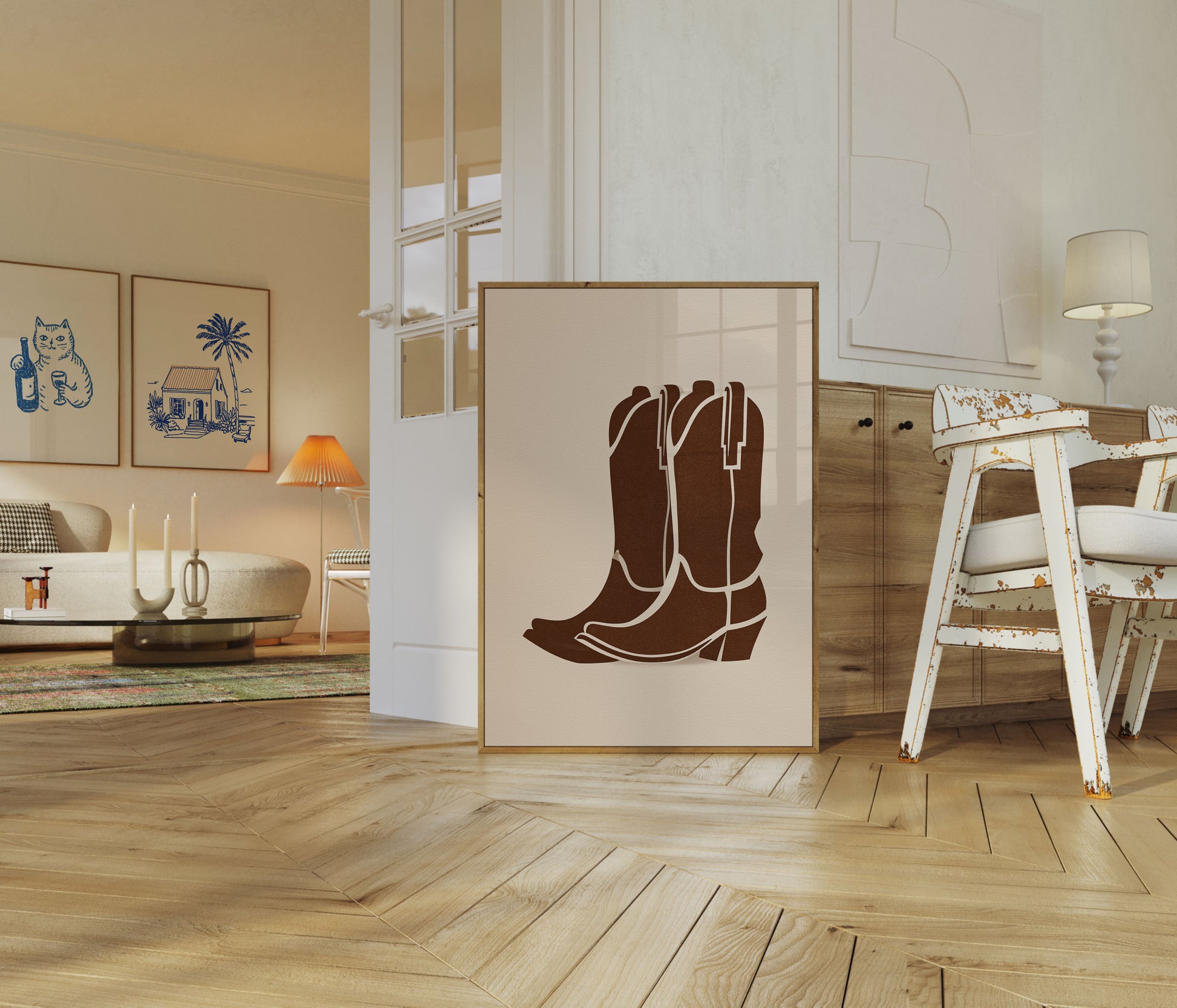 Capture the spirit of the Wild West with this stunning minimalist illustration of iconic cowboy boots. Rich brown tones and clean white accent lines create a timeless silhouette that celebrates American frontier style. Perfect for adding rustic charm to any interior space.
