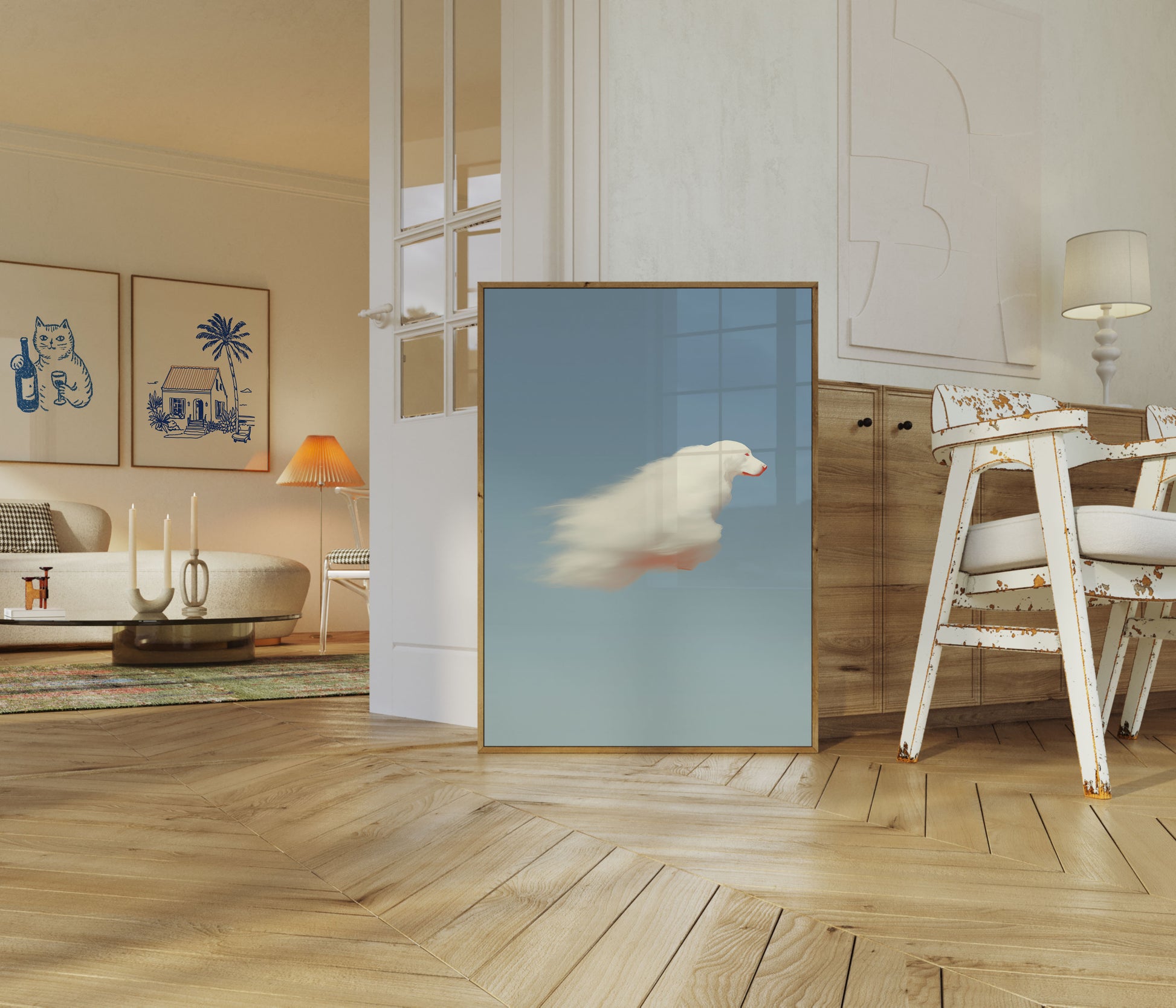 A dreamy, ethereal image of a white dog seemingly dissolving into a soft cloud against a serene blue-green background. The artwork blends the animal's form with misty, flowing textures, creating a surreal and mesmerizing visual experience that challenges perception and invites contemplation.