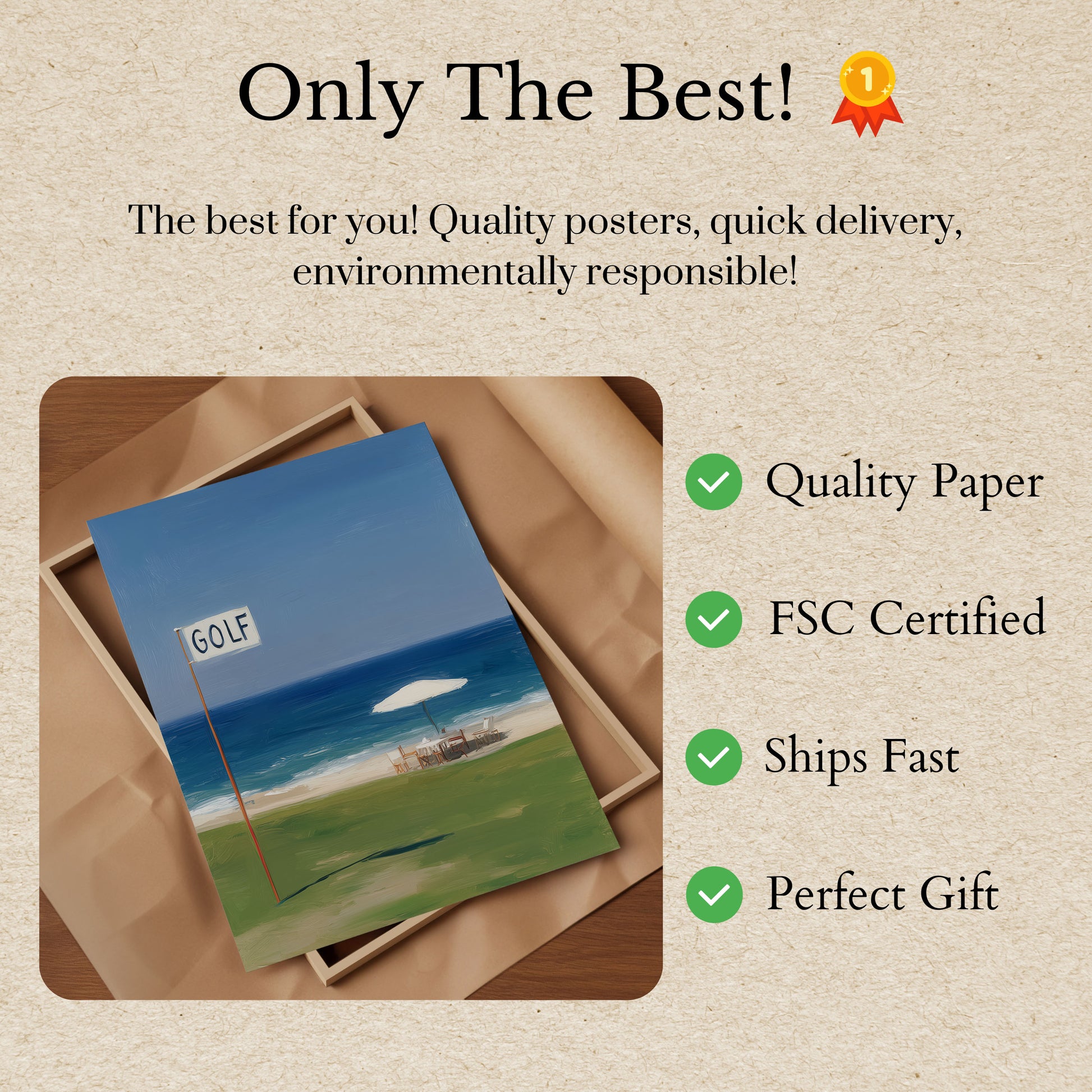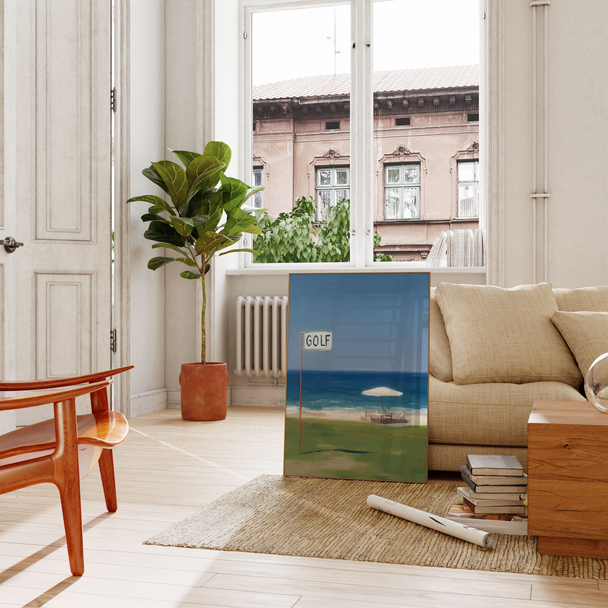 Immerse yourself in the serene beauty of this coastal golf landscape, where a pristine green fairway meets the sparkling blue ocean. A simple 'GOLF' flag stands tall, inviting relaxation and leisure against a backdrop of soft blue sky and white beach umbrella. This artistic rendering captures the perfect blend of sport and tranquility.