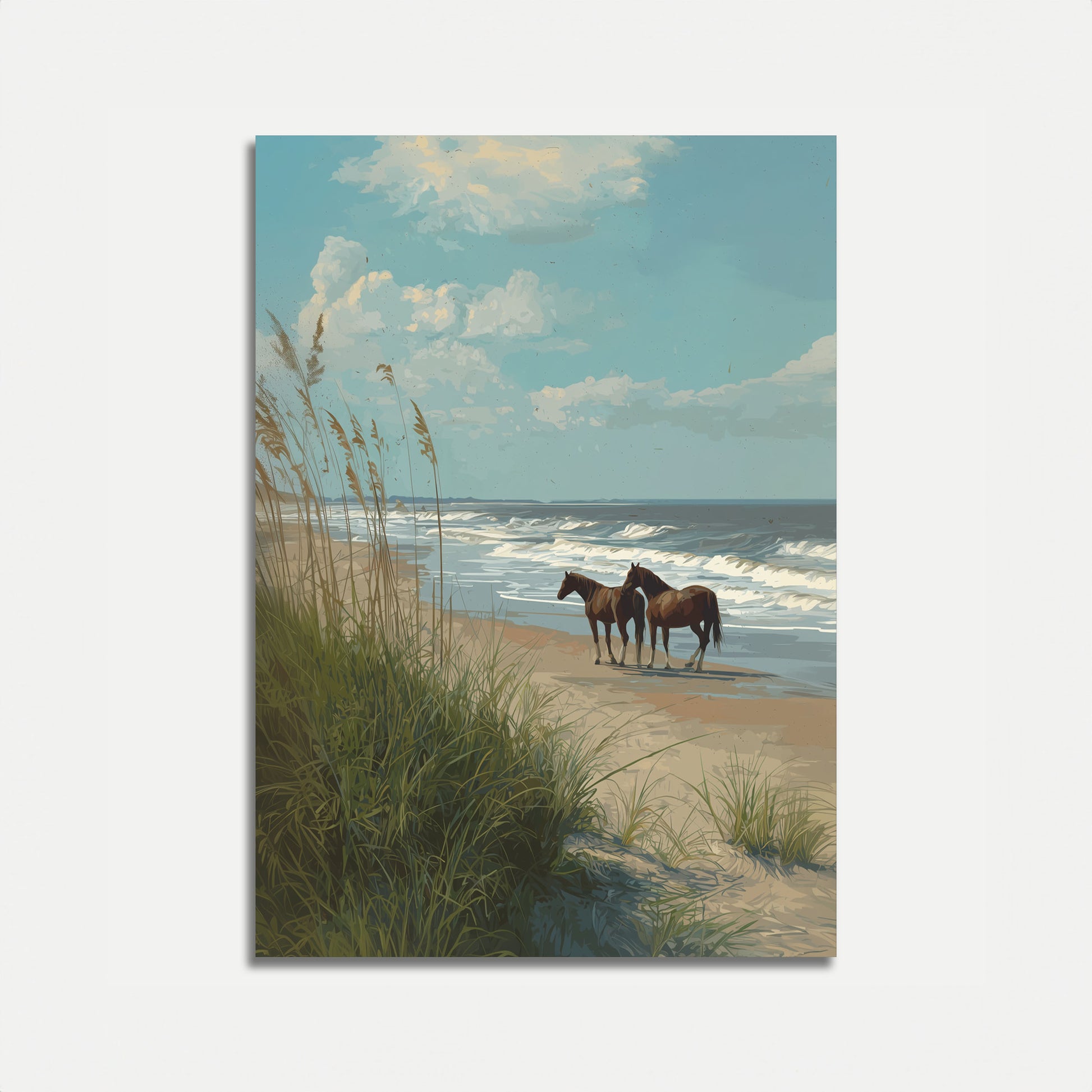Serene coastal landscape captures two majestic horses standing quietly on a sandy beach, with rolling waves and soft sea grass in the foreground. Delicate clouds drift across a tranquil blue sky, creating a peaceful and nostalgic scene that evokes the timeless beauty of coastal wilderness.