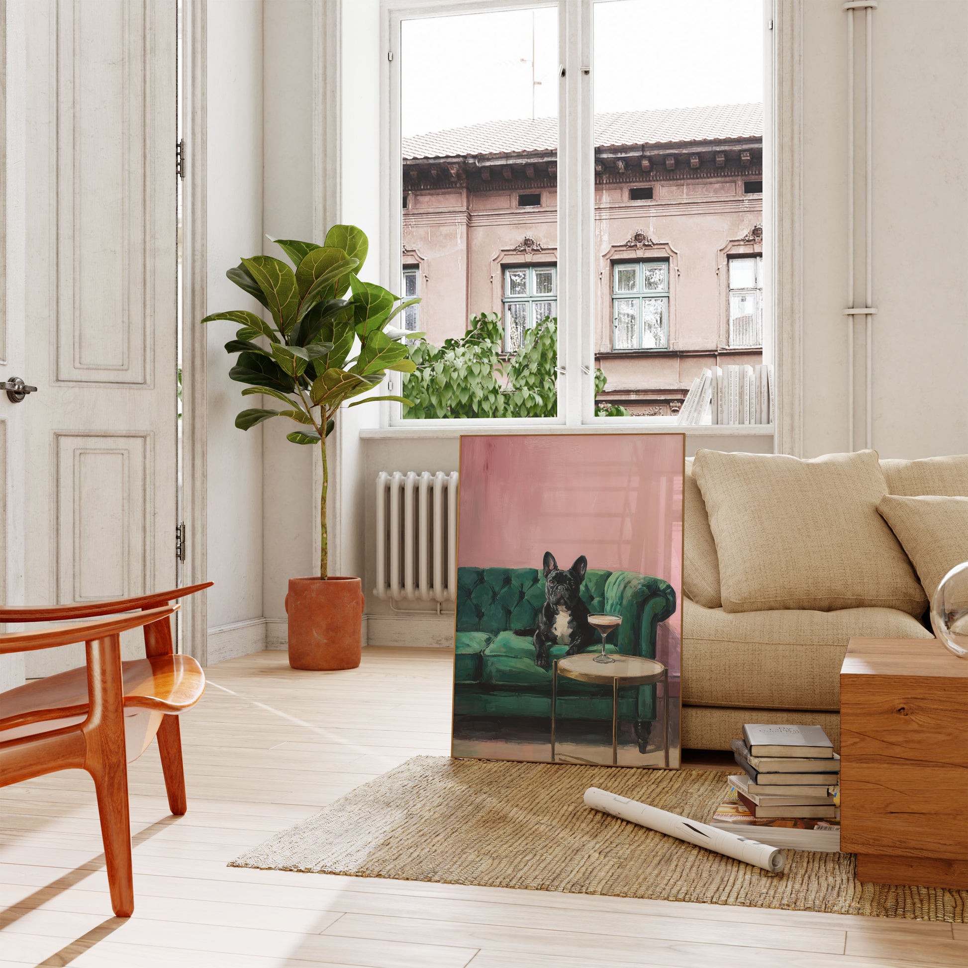 Indulge in the sophisticated charm of this stylish French Bulldog lounging on a luxurious emerald green chesterfield sofa, accompanied by an elegant cocktail. The soft pink background creates a playful and modern atmosphere that blends whimsy with refined aesthetics. This charming art piece captures the perfect balance of canine cool and contemporary design.