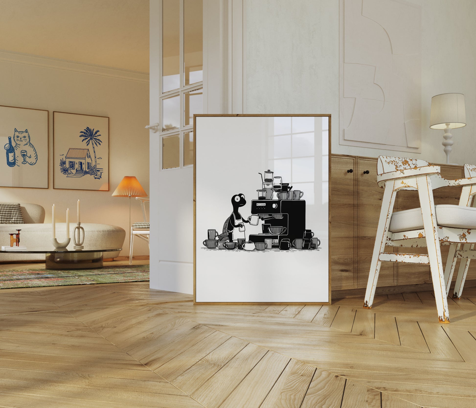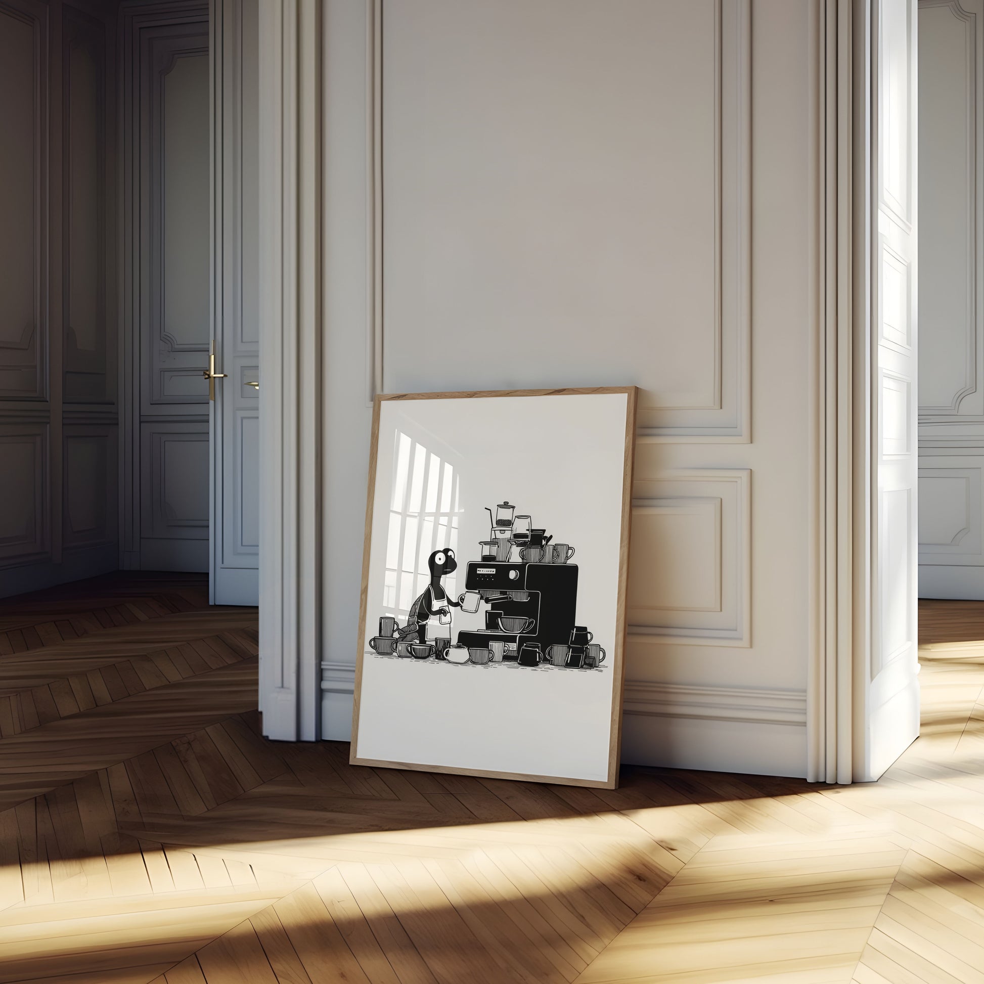 Step into the quirky world of an adorable cartoon character mastering the art of coffee brewing. This charming black and white illustration captures a playful creature wearing an apron, surrounded by a delightful chaos of coffee mugs, an espresso machine, and brewing equipment. The whimsical scene celebrates the joy and complexity of coffee culture with a touch of endearing simplicity.