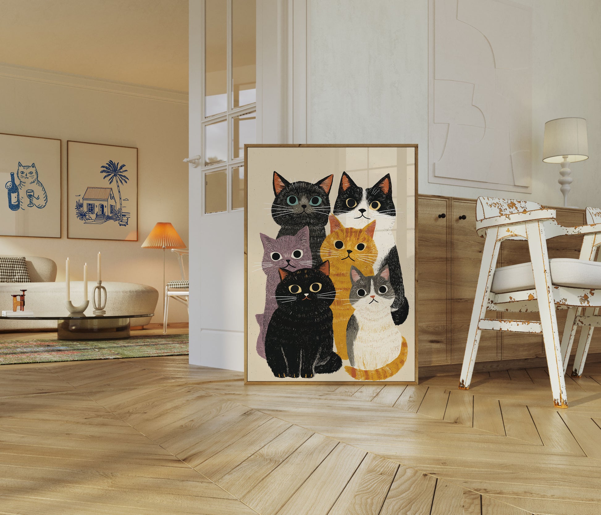 A delightful collection of six cats showcasing a beautiful array of colors and personalities. Each feline friend is uniquely rendered with expressive eyes and textured fur, creating a charming and playful artwork that cat lovers will adore. From sleek black and soft purple to vibrant orange and classic white and black, this poster captures the diverse and enchanting world of cats.