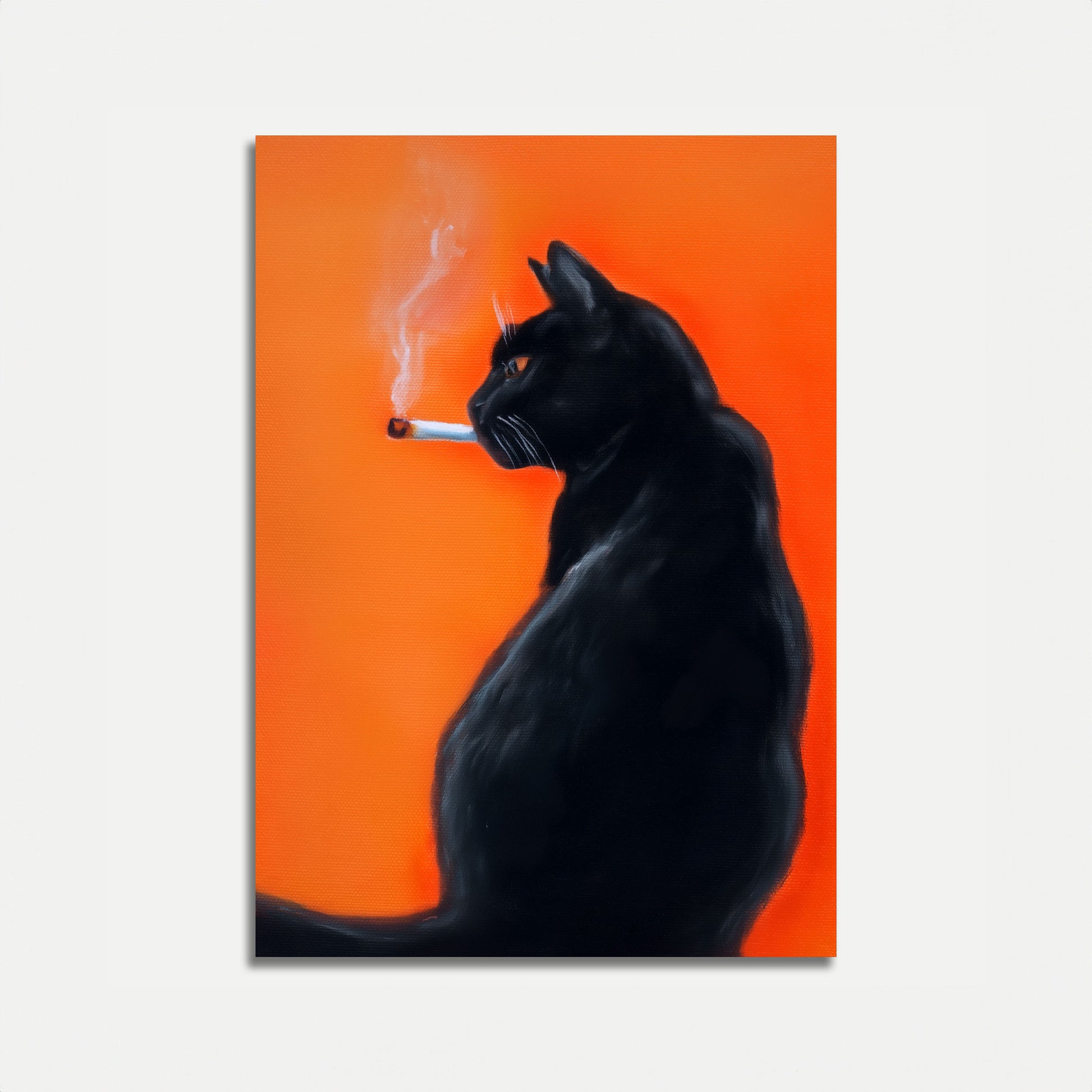A sleek black cat strikes a rebellious pose against a vibrant orange background, cigarette delicately balanced between its lips. The artwork captures an unexpected moment of feline attitude, blending humor and edgy style with its high-contrast color palette and smooth, stylized rendering.