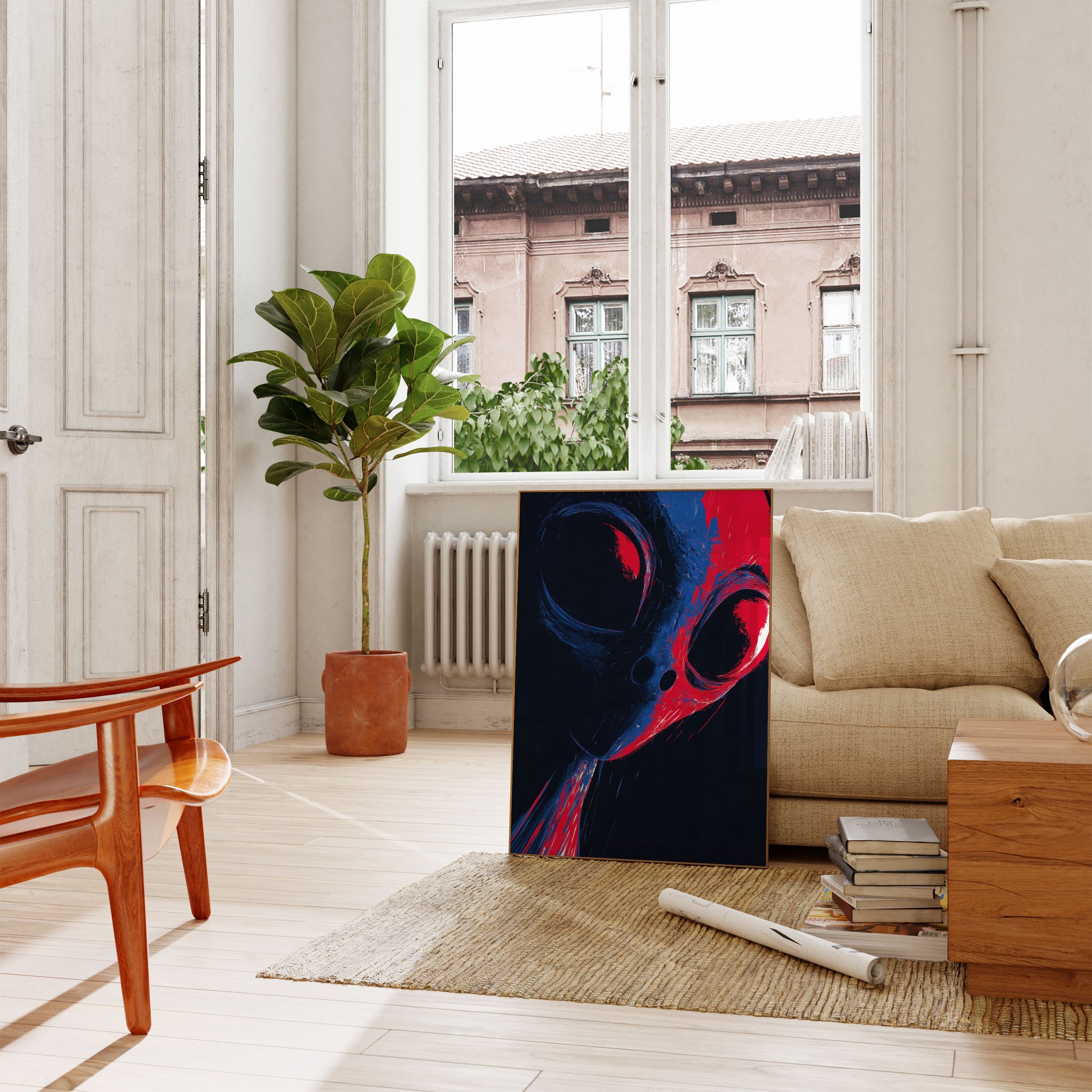 A mesmerizing abstract artwork featuring an ethereal alien form crafted from dynamic swirls of deep navy blue and vibrant red. The image captures a mysterious, almost sentient shape with fluid motion and intense color contrast, suggesting an otherworldly presence emerging from darkness. The sweeping curves and explosive color palette create a sense of mysterious energy and extraterrestrial movement.