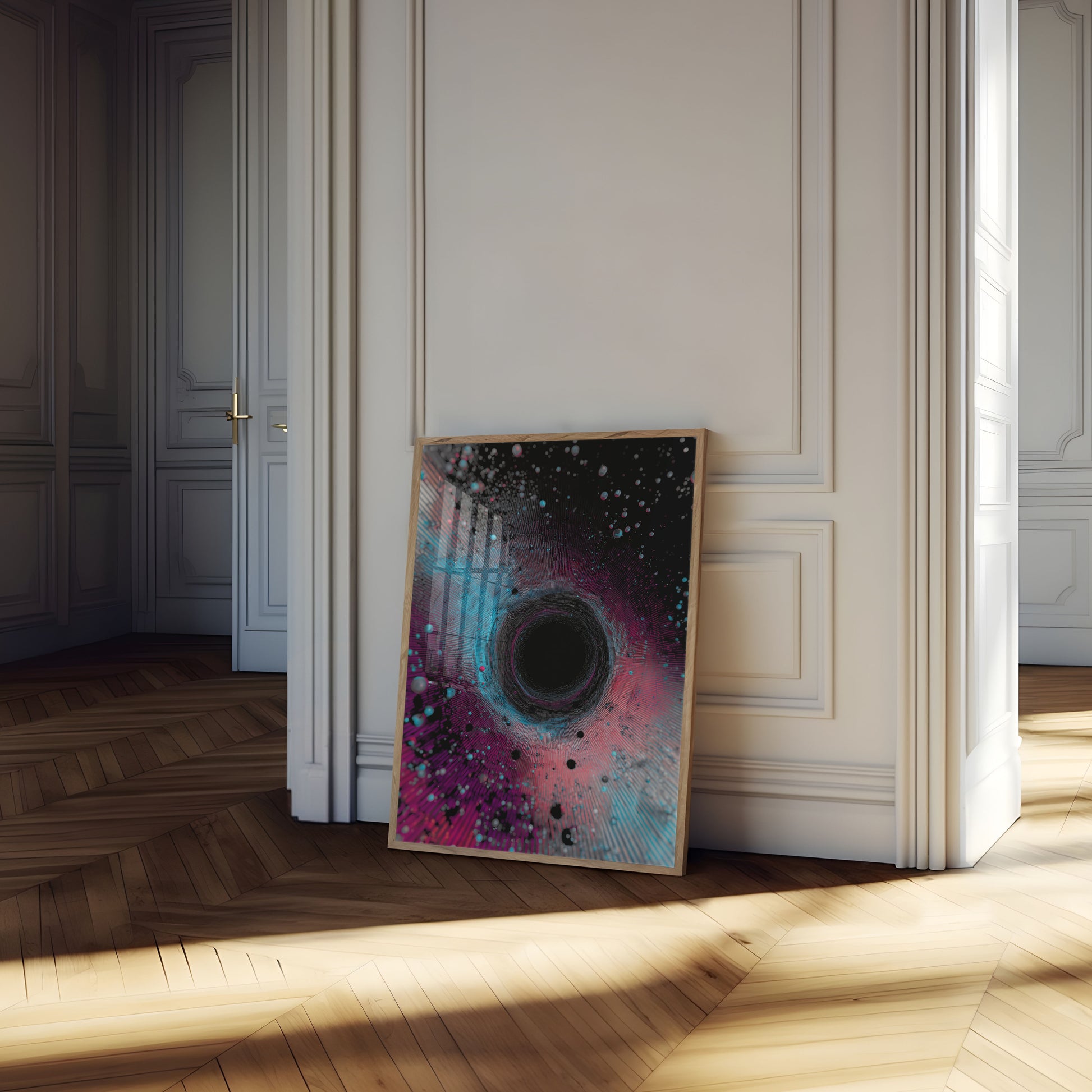 Dive into the mesmerizing depths of this stunning cosmic visualization, where swirling blues, purples, and teals blend into a hypnotic black hole vortex. Intricate lines and floating spherical particles create a sense of dynamic motion and infinite space, drawing the viewer into an immersive astronomical experience.