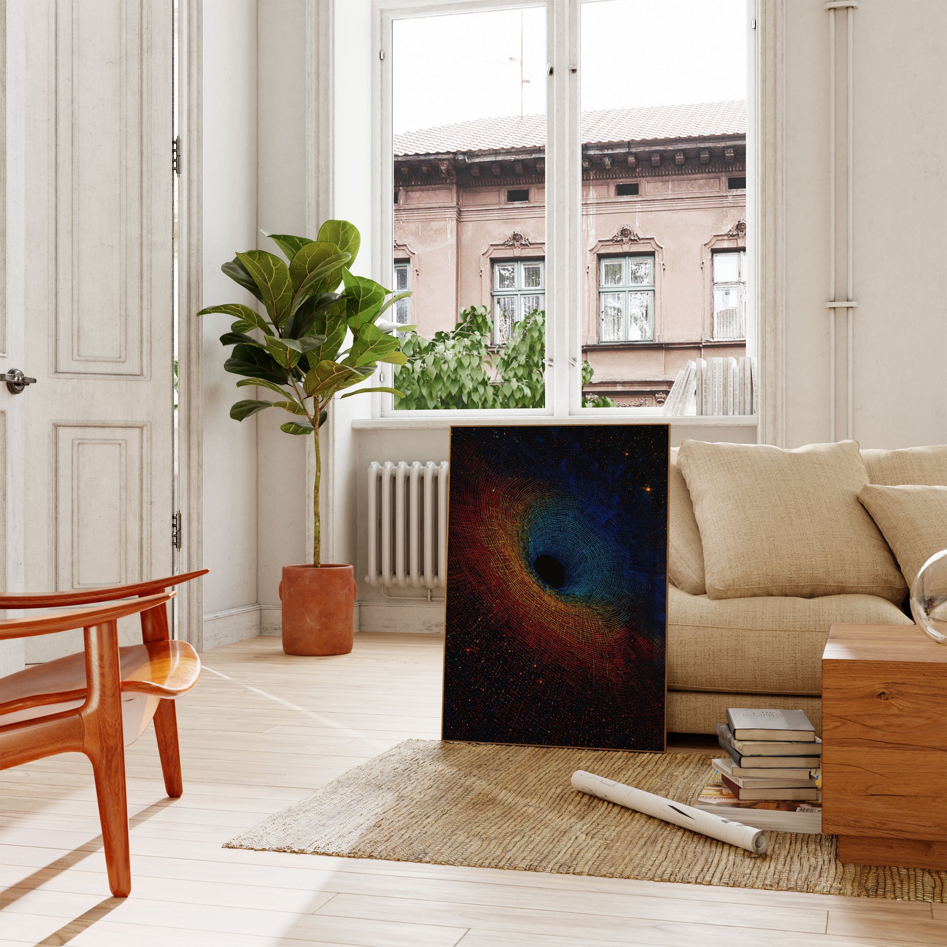 Immerse yourself in the mesmerizing depths of this stunning astronomical visualization. A swirling cosmic vortex radiates with a breathtaking spectrum of colors, transitioning from deep crimson to brilliant blue, capturing the dynamic energy of a black hole's gravitational pull. The intricate grid-like patterns create a sense of motion and intensity against the starry dark background, inviting viewers into the mysterious heart of space.