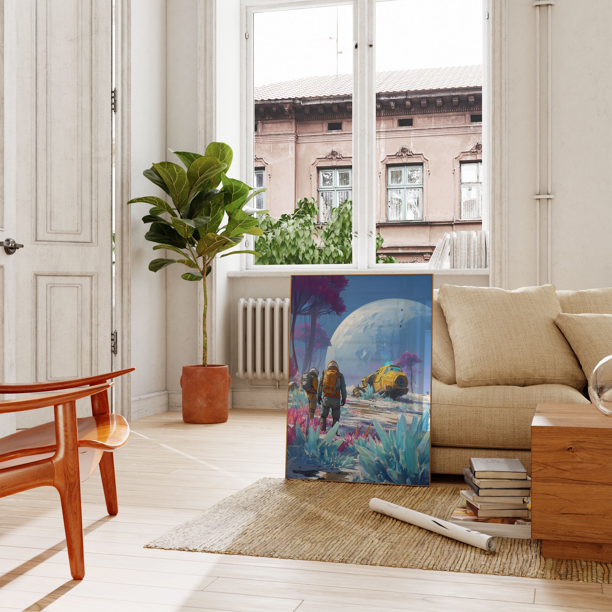 Discover an ethereal alien landscape where two astronauts traverse a surreal terrain of blue crystal formations and magenta trees. A massive pale planet looms in the background, creating an otherworldly scene of exploration and wonder. Vibrant colors and intricate details invite viewers into a mesmerizing extraterrestrial journey.
