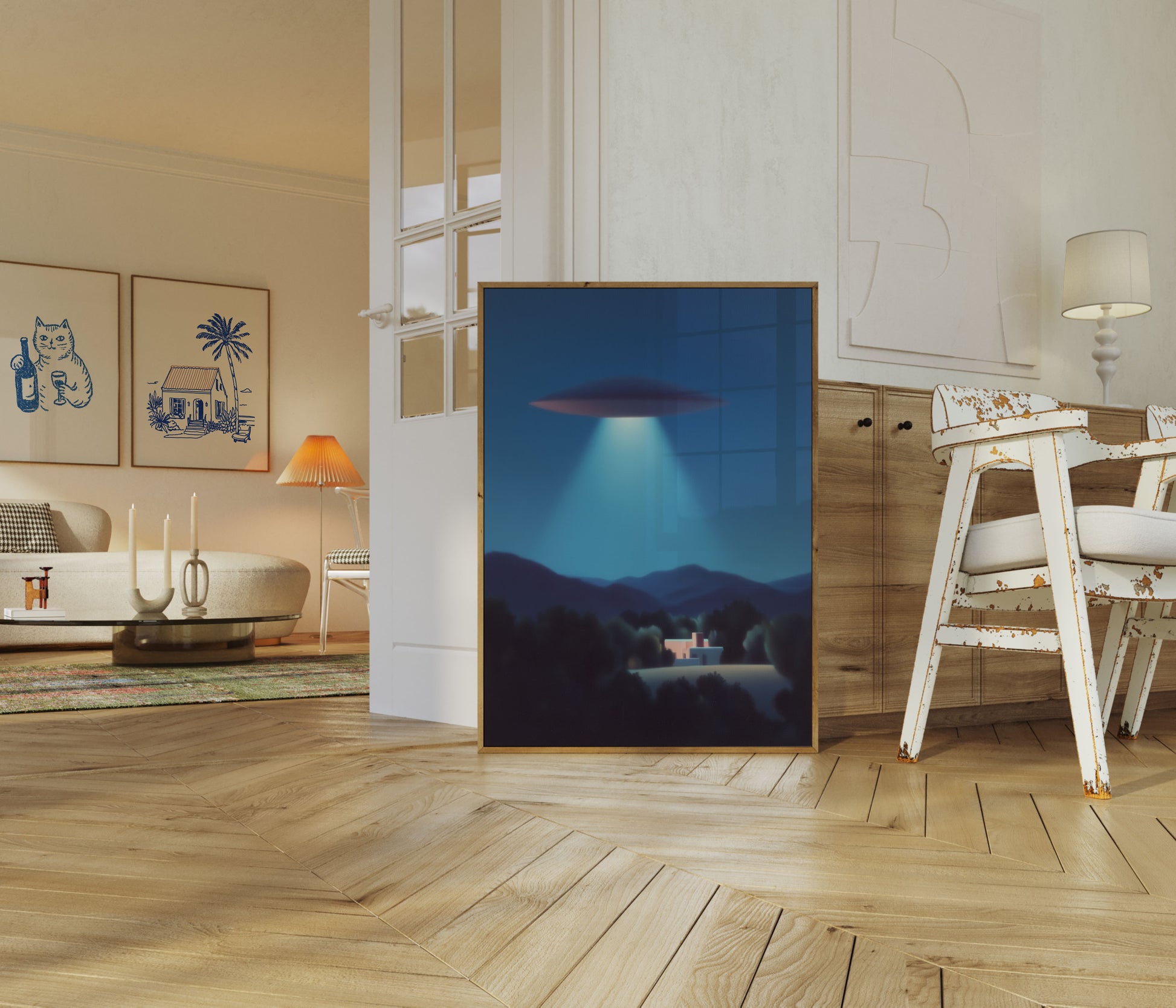 A mysterious UFO hovers above a serene mountain landscape, casting an ethereal blue beam of light onto a solitary building below. The deep blue night sky creates an atmosphere of wonder and intrigue, capturing the imagination of those fascinated by extraterrestrial encounters and cosmic mysteries.