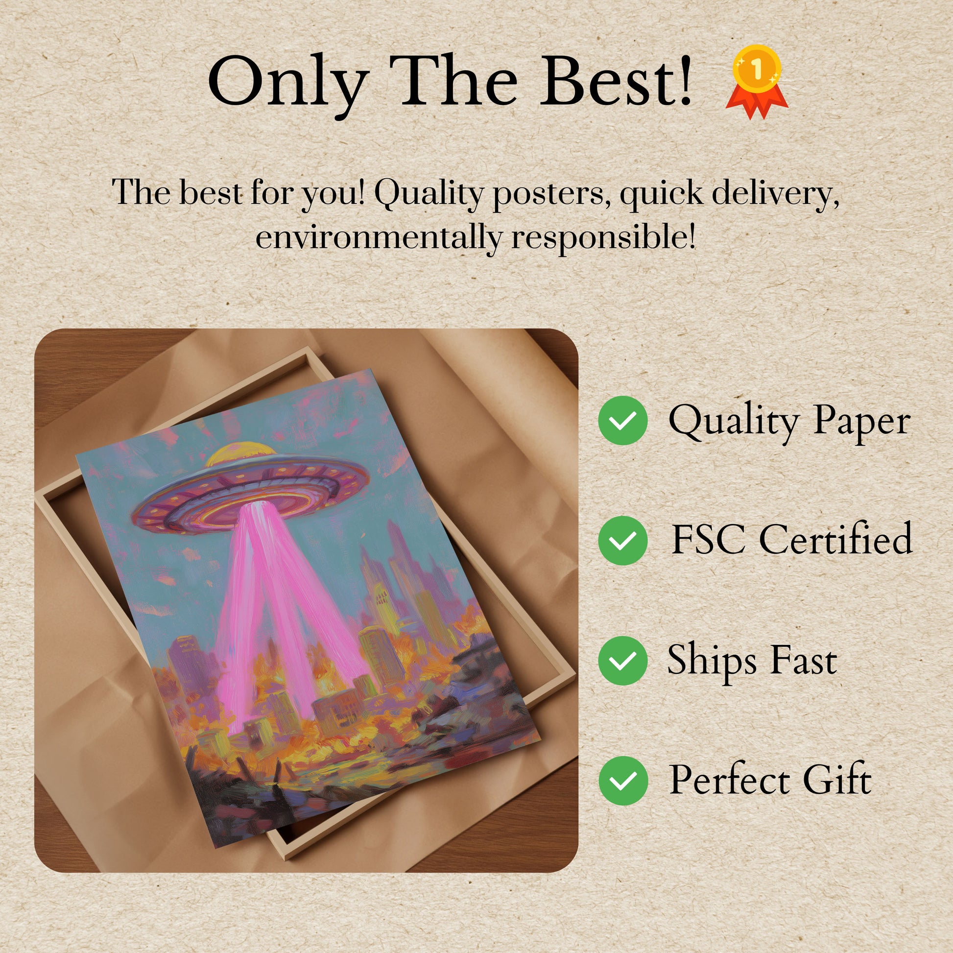 Witness an electrifying scene of extraterrestrial chaos as a massive pink-beamed UFO hovers menacingly over a burning cityscape. This vibrant art piece captures a surreal moment of alien intervention, with a classic flying saucer casting an otherworldly pink light that engulfs skyscrapers and urban landscapes in a dreamlike palette of blues, pinks, and fiery oranges. The painting pulses with energy, transforming a potential apocalyptic moment into a mesmerizing visual experience that blends sci-fi drama with impressionistic color techniques.
