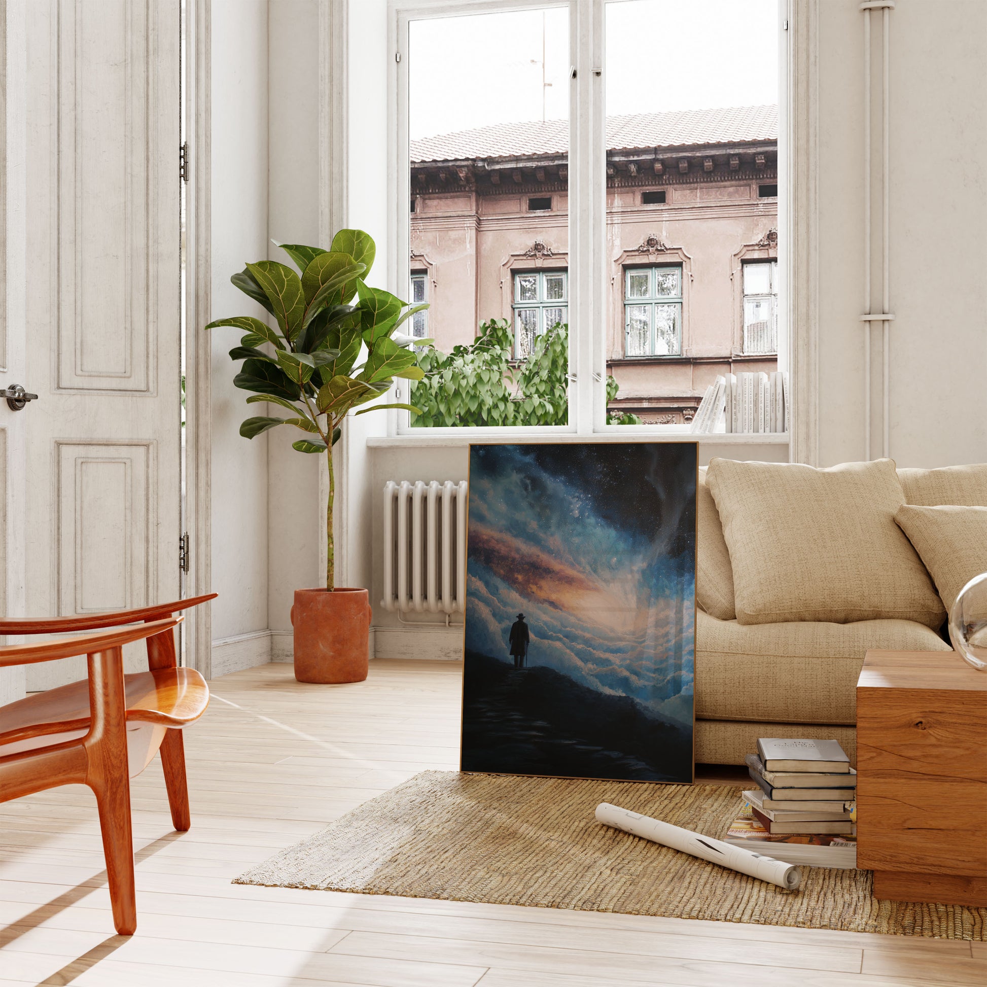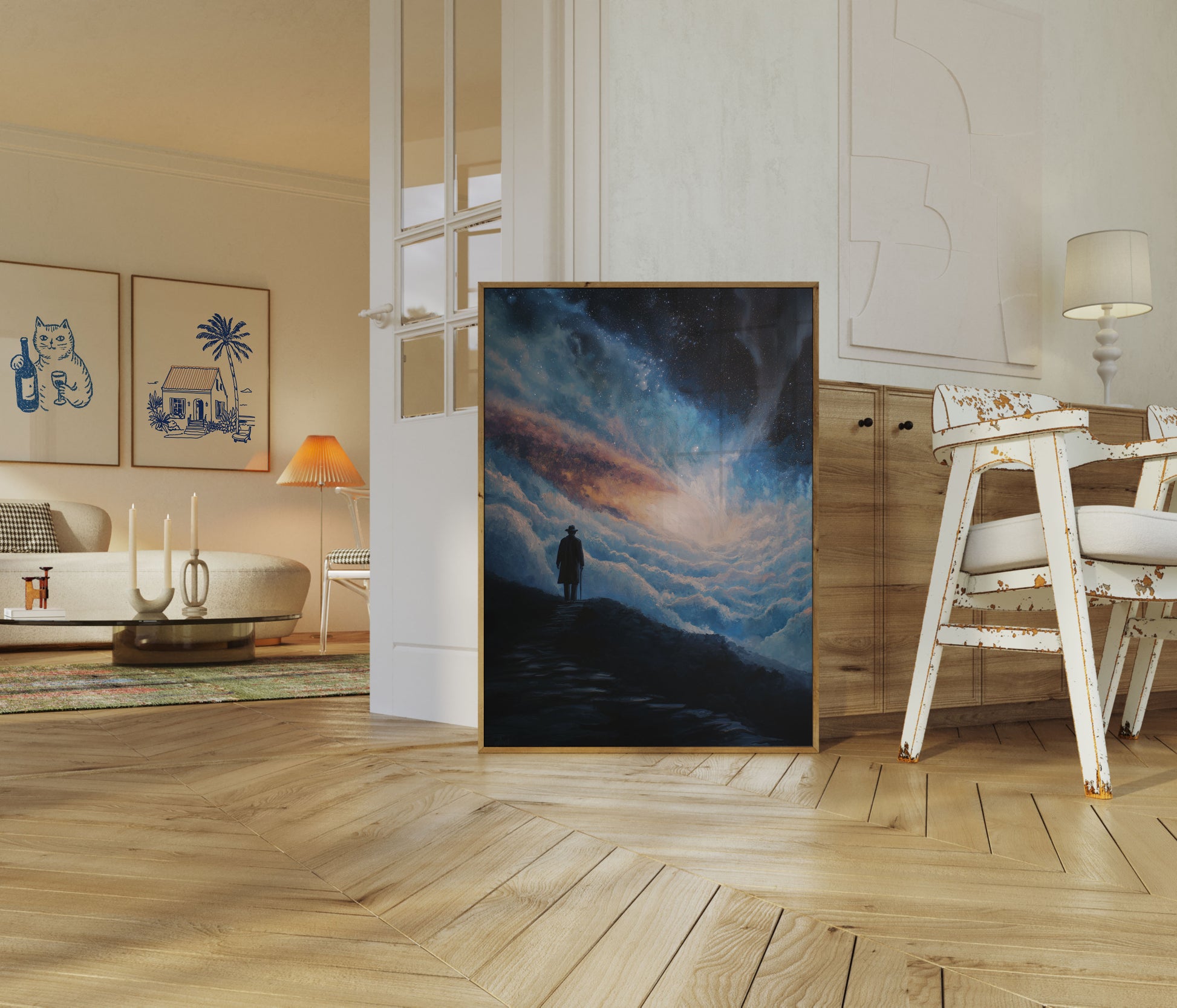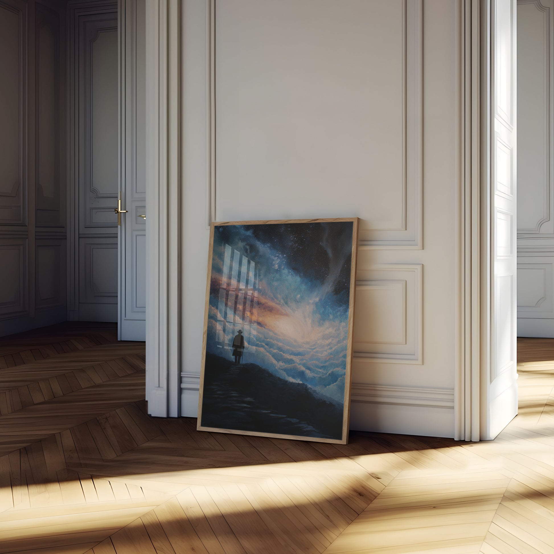 A solitary figure stands atop a rocky path, gazing into a mesmerizing cosmic landscape of swirling clouds and starry galaxies. The painting captures a profound moment of introspection, where the small silhouette is dwarfed by the magnificent, ethereal universe surrounding them. Soft blues, golden oranges, and sparkling stars create a dreamlike atmosphere of wonder and existential reflection.