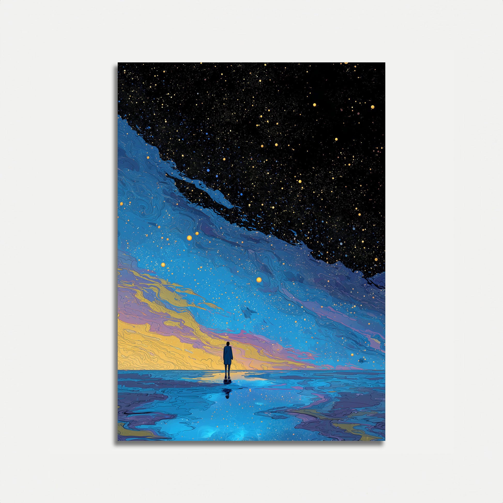 A breathtaking celestial landscape captures a lone figure standing on a reflective surface, surrounded by swirling blues, yellows, and purples against a starry night sky. The artwork evokes a sense of wonder, isolation, and infinite possibility, inviting viewers to explore the boundaries between inner and outer worlds.