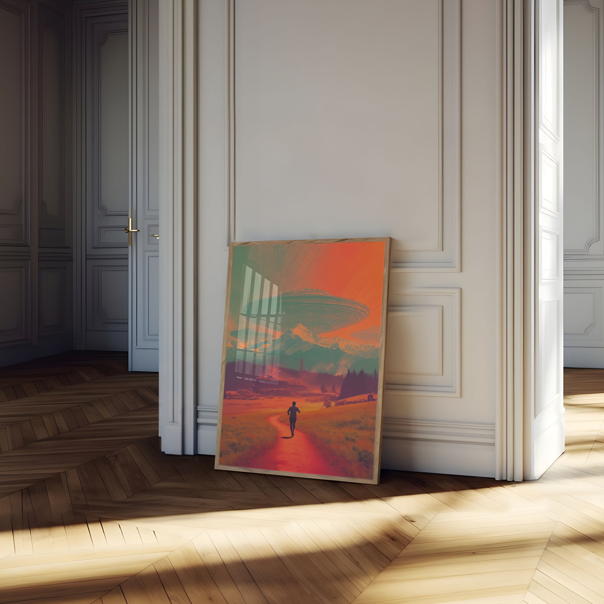 A surreal landscape where massive UFOs hover above snow-capped mountain peaks, casting an ethereal glow across a mysterious terrain. A lone figure runs along a vibrant red path toward an enigmatic structure, creating a sense of anticipation and wonder in this sci-fi inspired artwork. The dreamlike color palette of orange, green, and red transforms an ordinary scene into an extraordinary extraterrestrial journey.