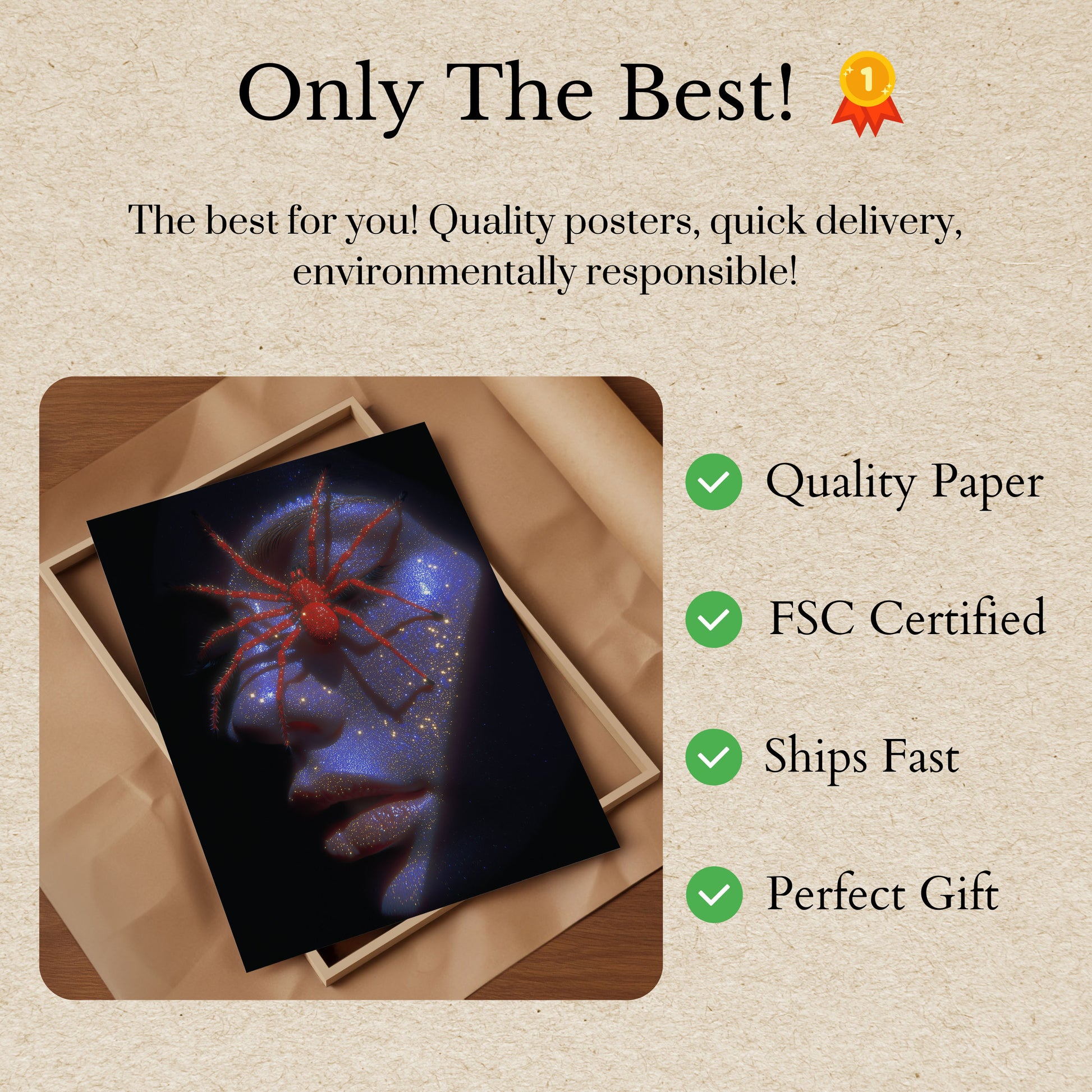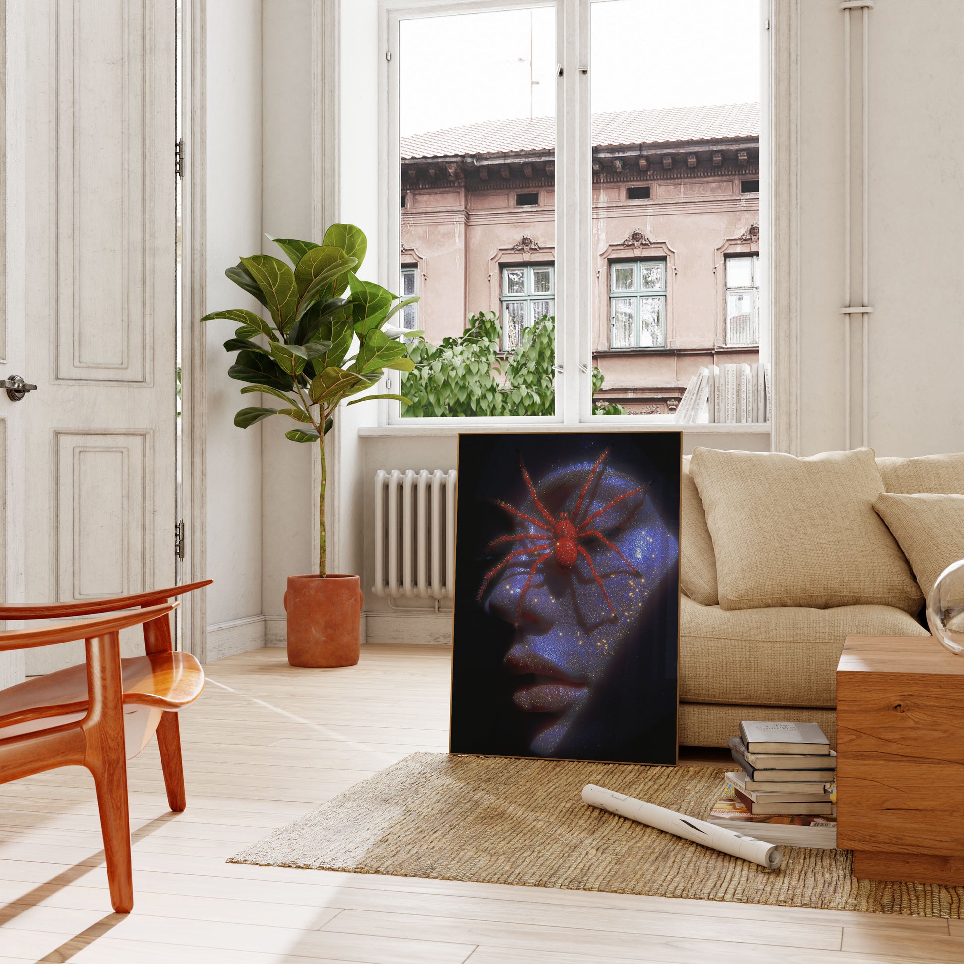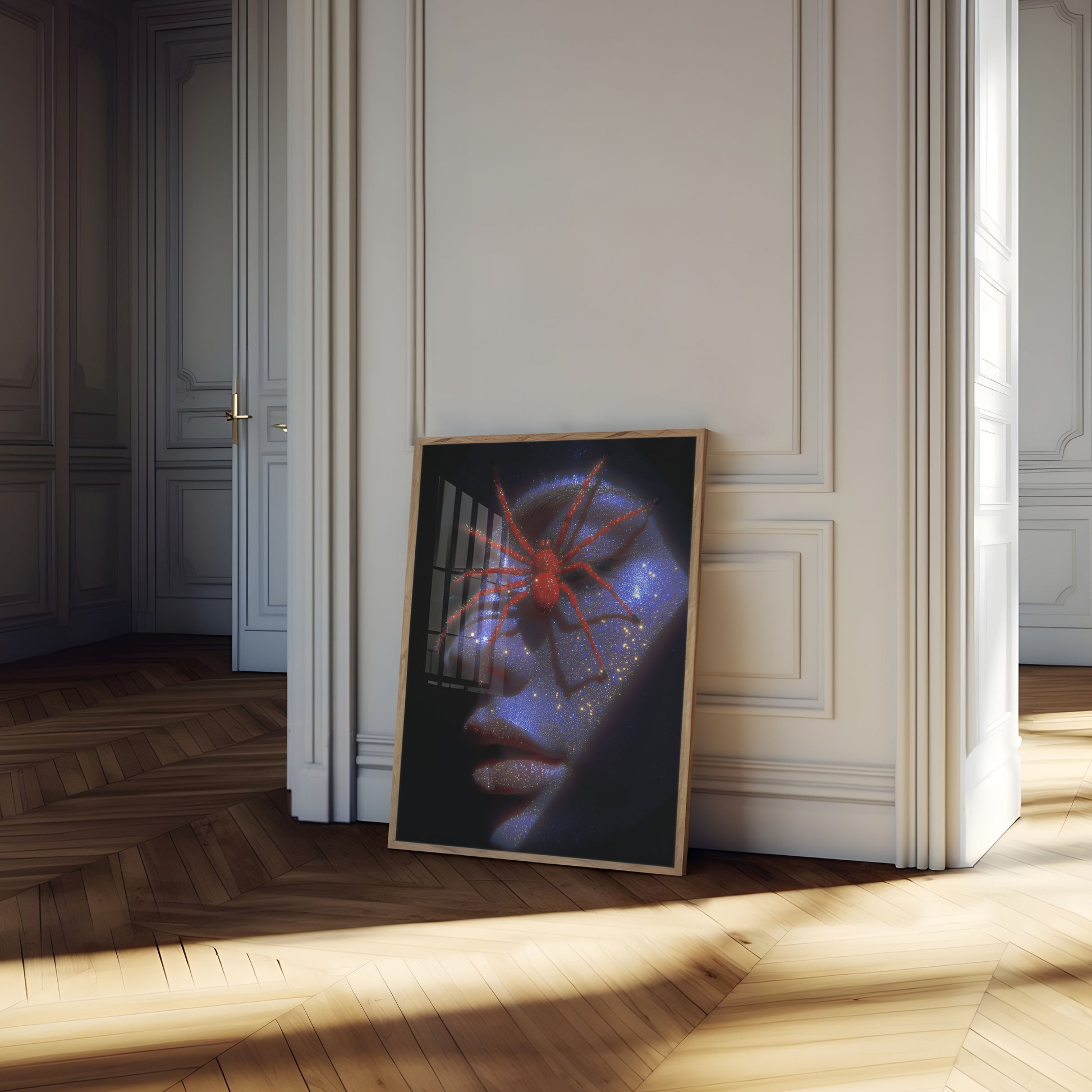This mesmerizing artwork transforms a red spider into a gateway to the cosmos, with its body and legs glowing against a stunning starfield backdrop. The vibrant contrast between the deep crimson arachnid and the brilliant blue and golden stars creates a truly otherworldly atmosphere that captivates the imagination. Perfect for those who appreciate surreal art, space exploration, and the wonders of nature combined in an unexpected and thought-provoking way.