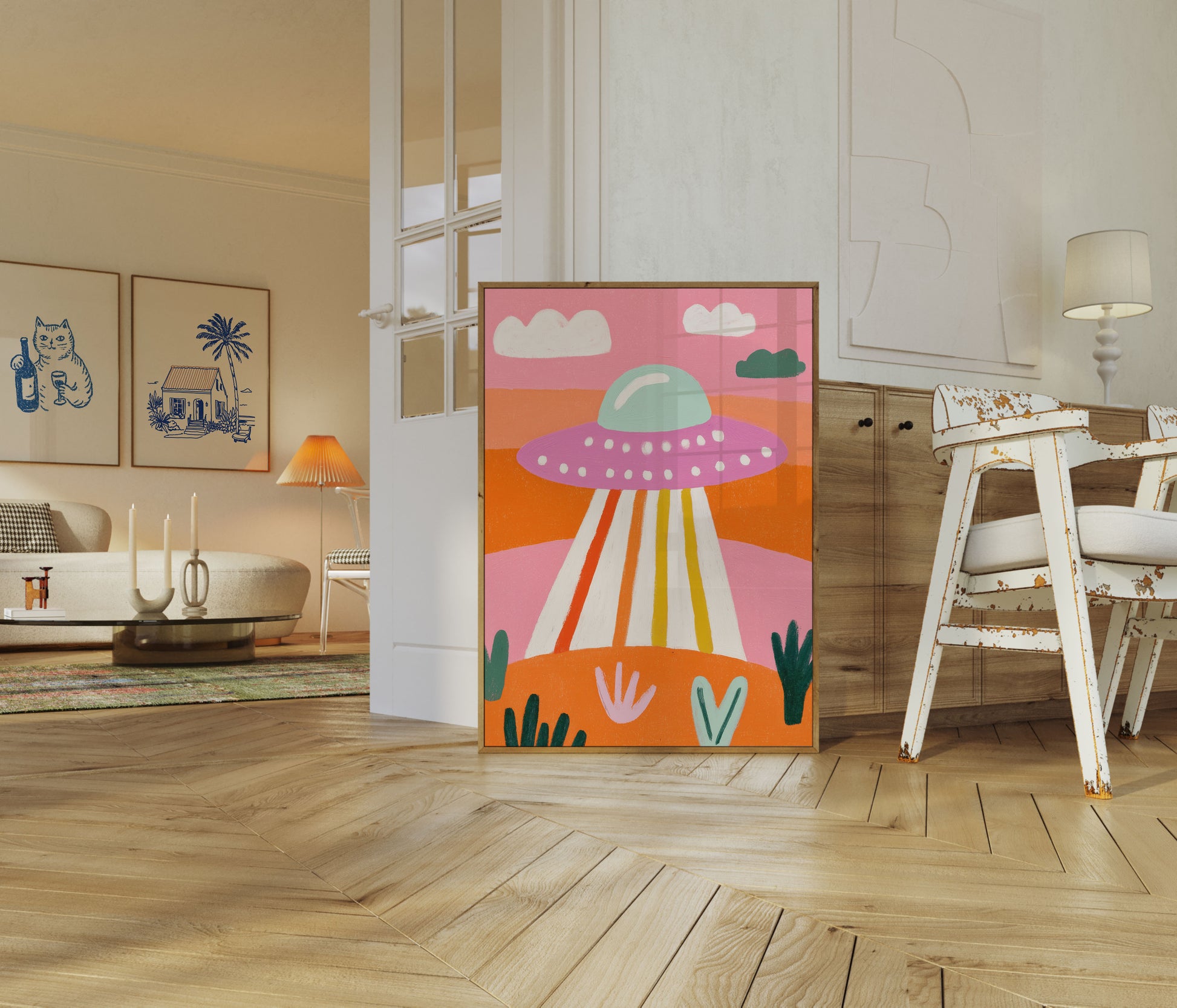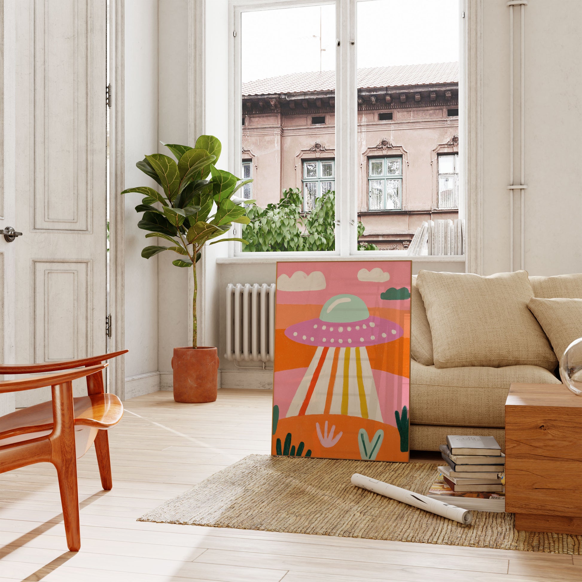 A vibrant and playful illustration of a purple and mint green UFO descending onto an orange desert landscape. Whimsical clouds float in a pink sky while stylized plants dot the terrain, creating a retro-inspired scene of extraterrestrial exploration.