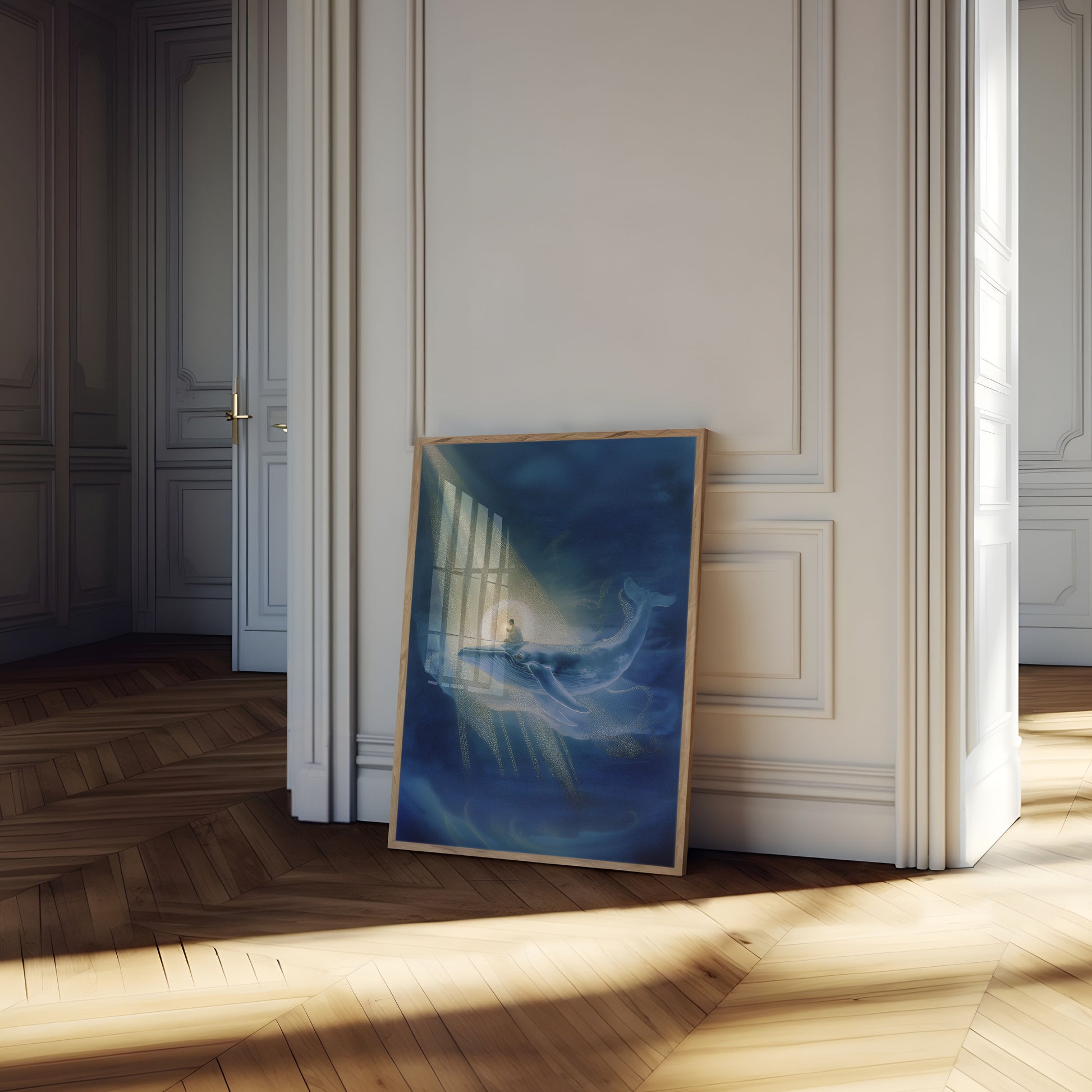 A mesmerizing artwork depicting a serene figure seated on a luminous blue whale, floating through a dreamlike underwater cosmos. Soft blue and golden light streams create a transcendent atmosphere of peace and spiritual connection, blending marine life with meditative tranquility.