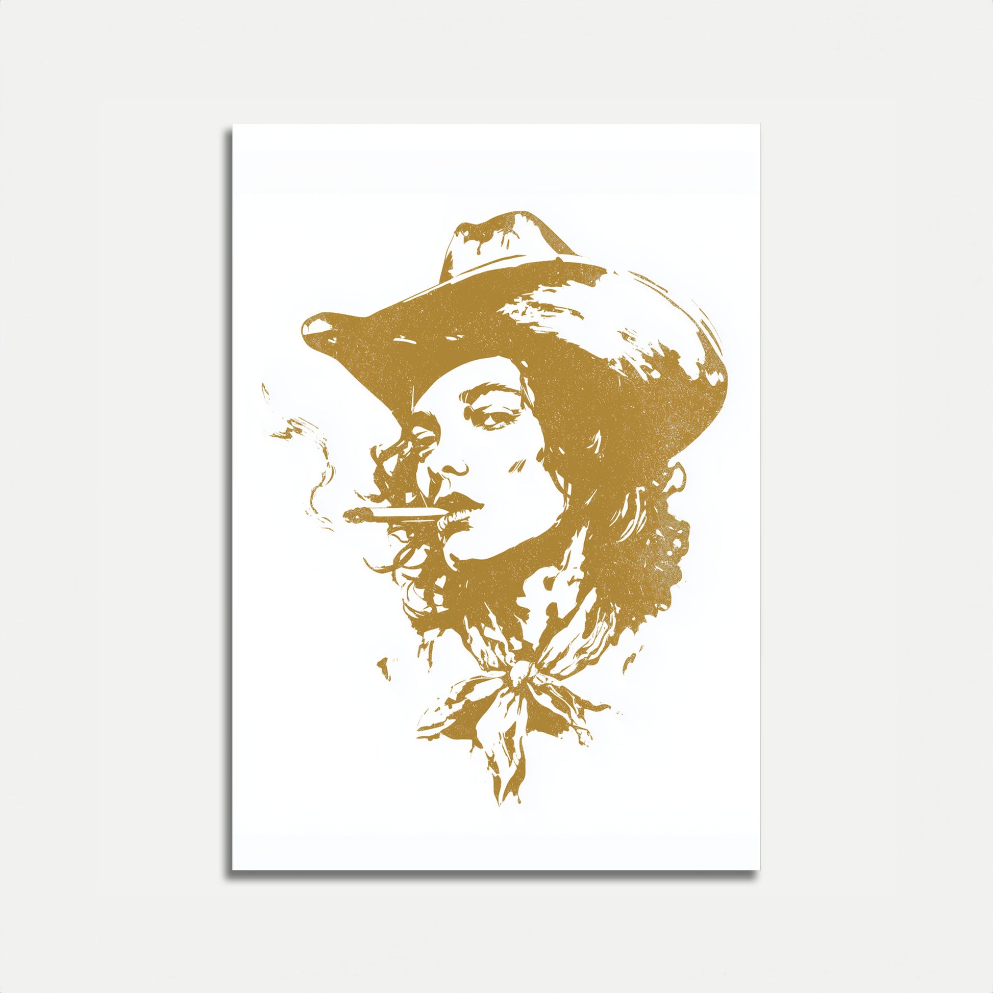 Capture the spirit of the Wild West with this stunning golden-toned graphic art print featuring a stylish cowboy in a classic wide-brimmed hat. The striking silhouette portrays a smoky, rebellious attitude with a cigarette and a dramatic flower accent, creating a timeless piece of Americana art.