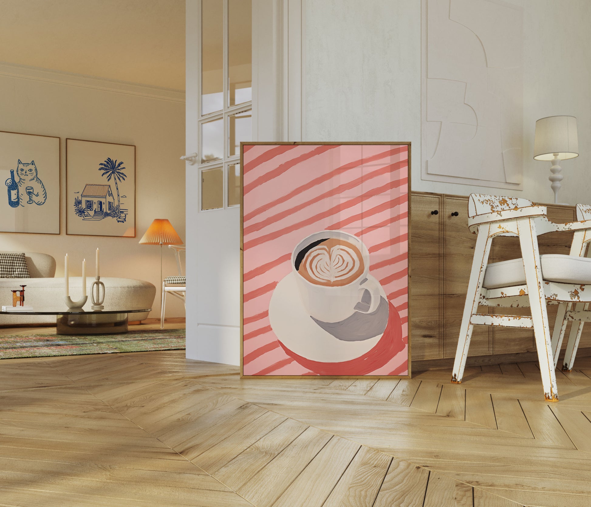 Indulge in the warmth of this delightful latte art poster, where a perfectly crafted coffee creation sits nestled in a crisp white mug against a dreamy coral and pink striped background. The intricate heart-shaped latte art swirls gracefully in rich caramel tones, capturing the artistry and passion of coffee culture in a single, mesmerizing image. This poster brings a touch of café comfort and artistic charm to any space, inviting viewers to pause and appreciate the beauty of a perfectly prepared coffee.