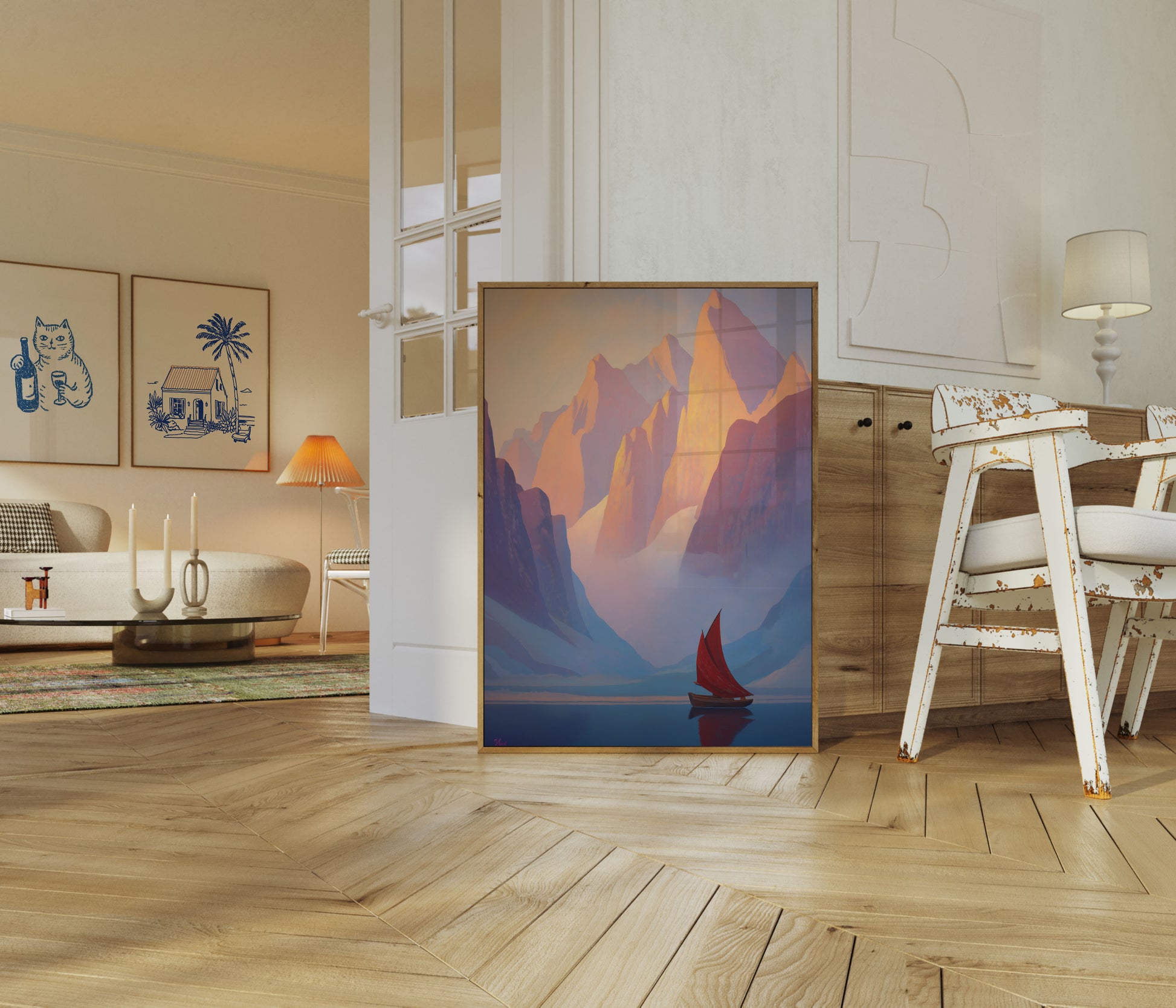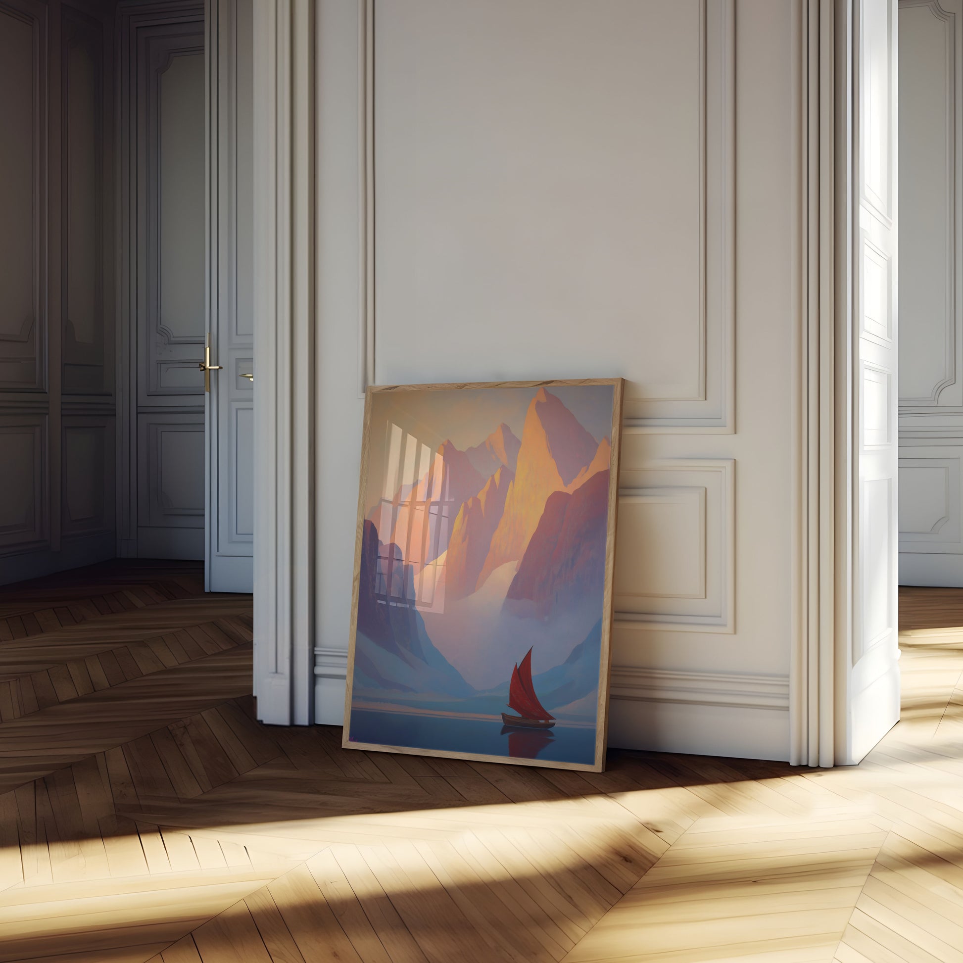 A breathtaking landscape emerges, where majestic golden-hued mountain peaks pierce through misty clouds, casting ethereal shadows across a serene blue water surface. A vibrant red-sailed boat drifts peacefully, creating a striking contrast against the tranquil mountainous backdrop. The artwork captures a moment of sublime stillness and epic natural beauty.