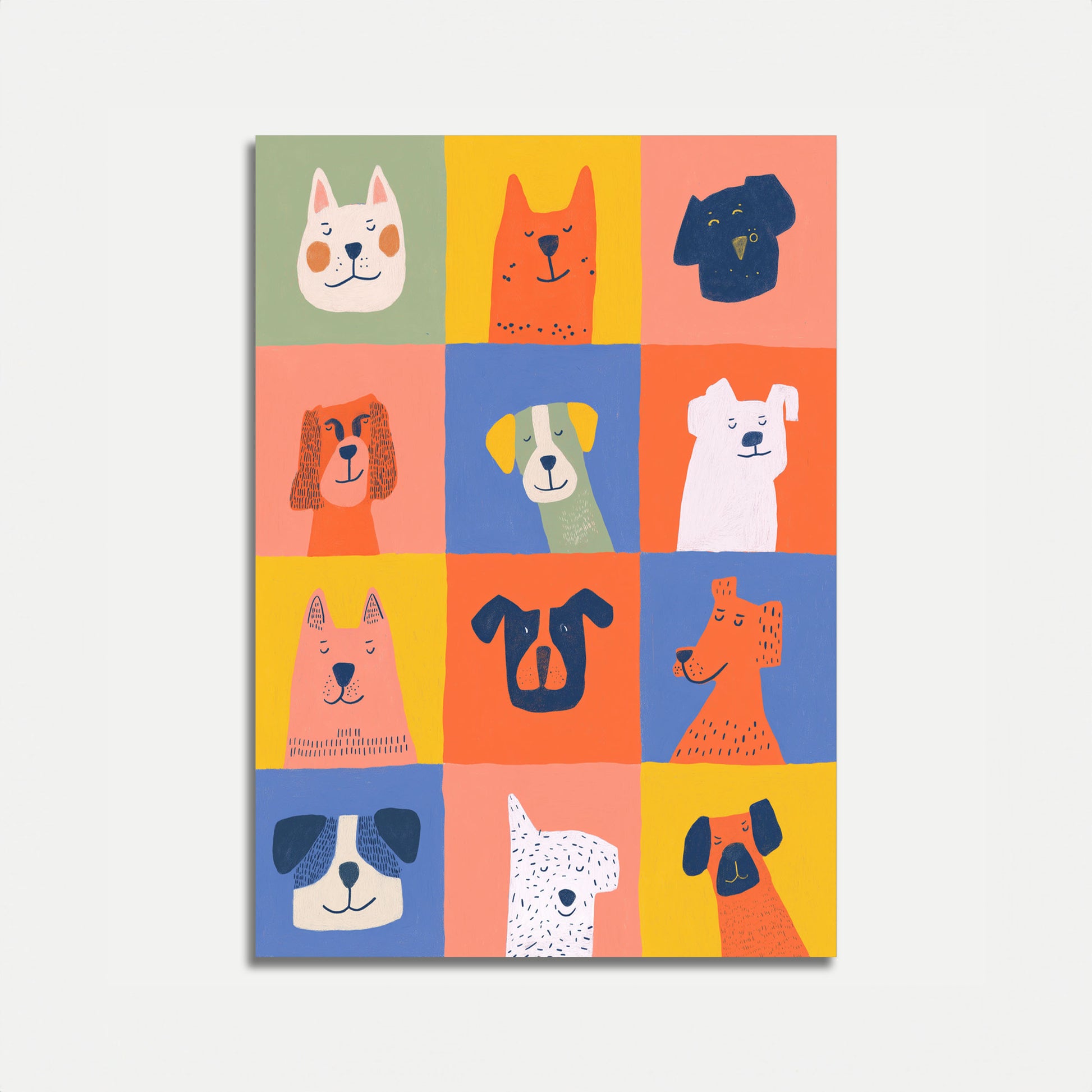 A delightful collection of charming dog illustrations in a vibrant grid layout. Each square showcases a unique dog breed with playful, minimalist styling and a bright, cheerful color palette. Perfect for dog lovers and art enthusiasts seeking a whimsical and modern wall decoration.