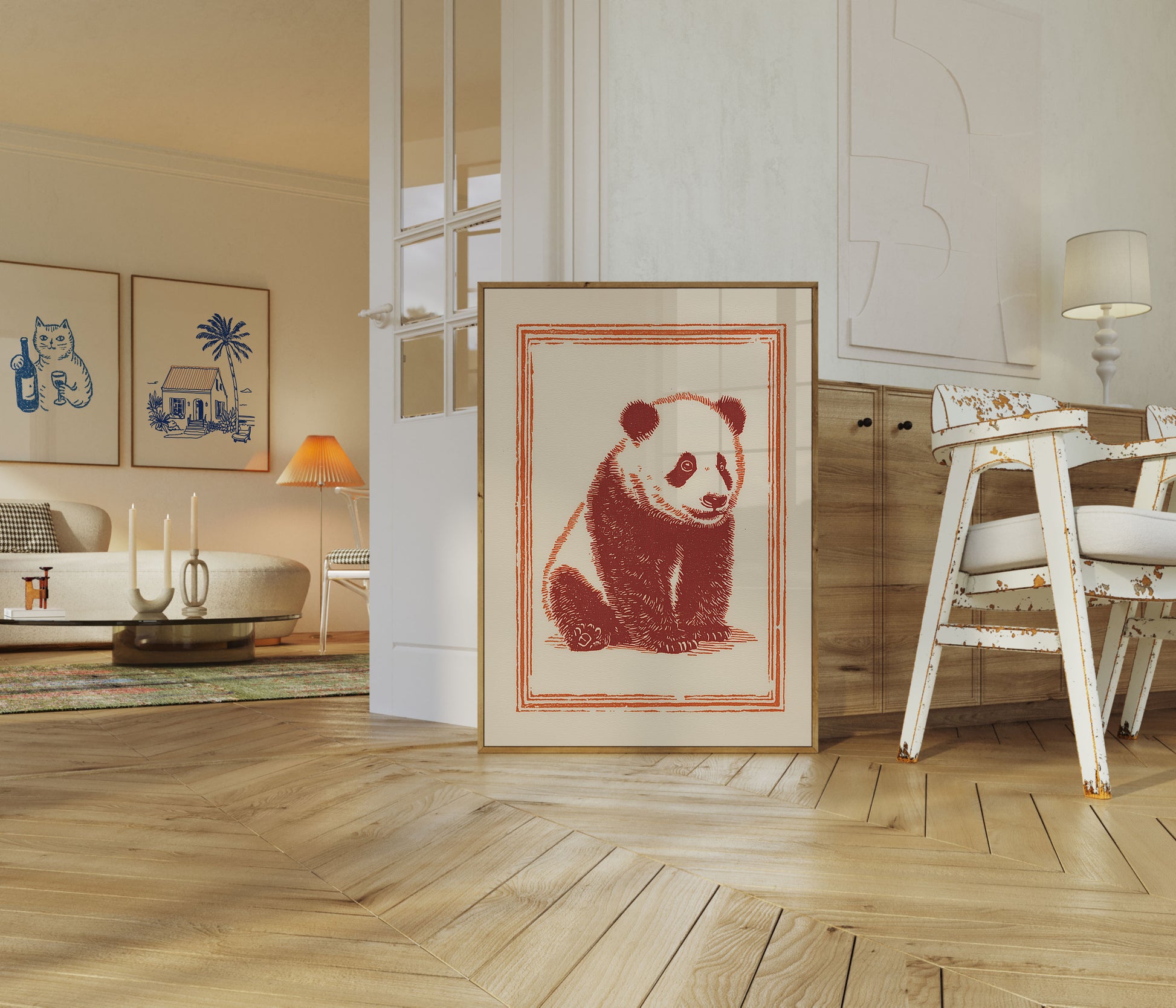 This stunning red and cream woodcut-style illustration captures a charming panda in a classic sitting pose. The detailed linework and textured shading bring incredible depth and character to this adorable animal portrait, creating a striking piece of art that will add warmth and personality to any space.