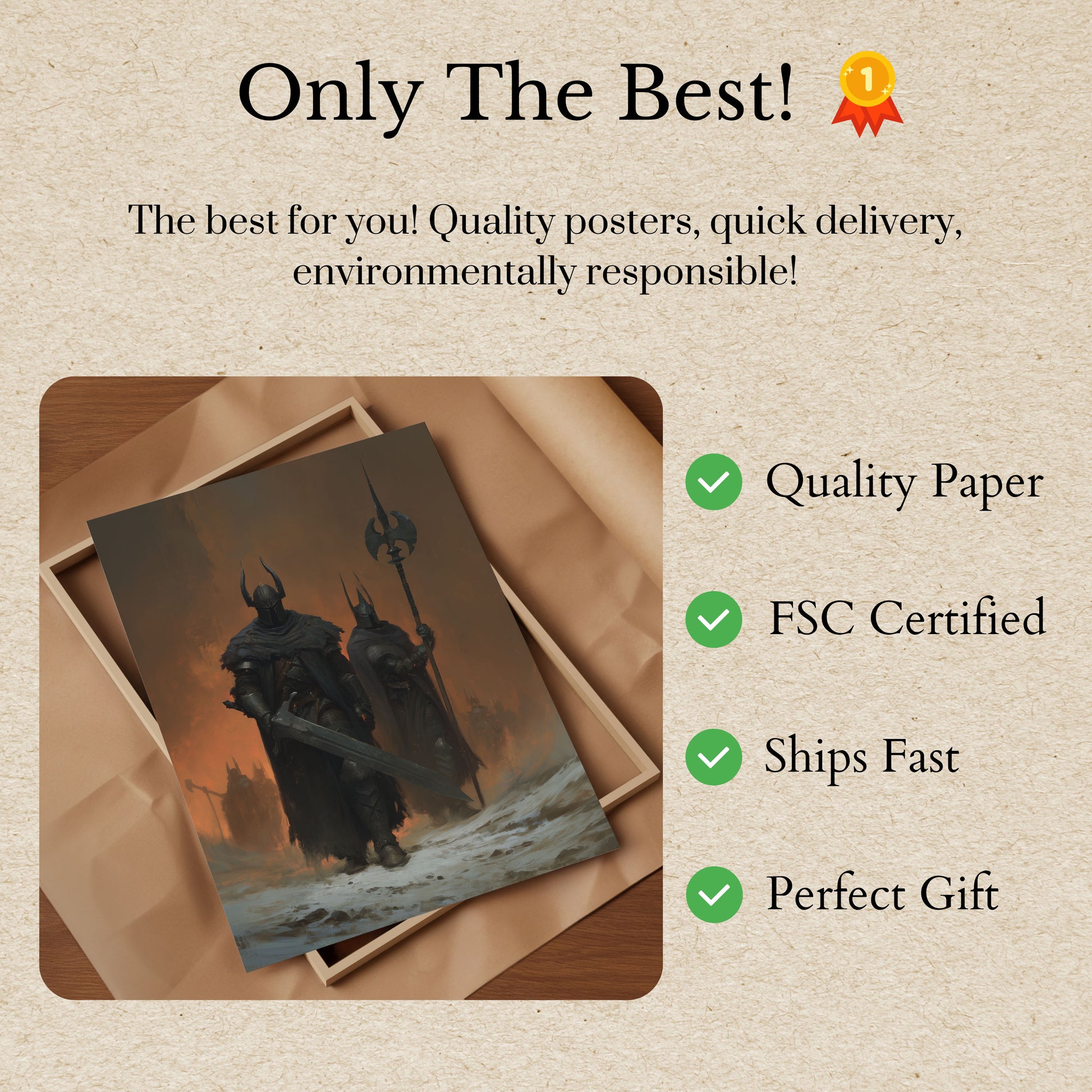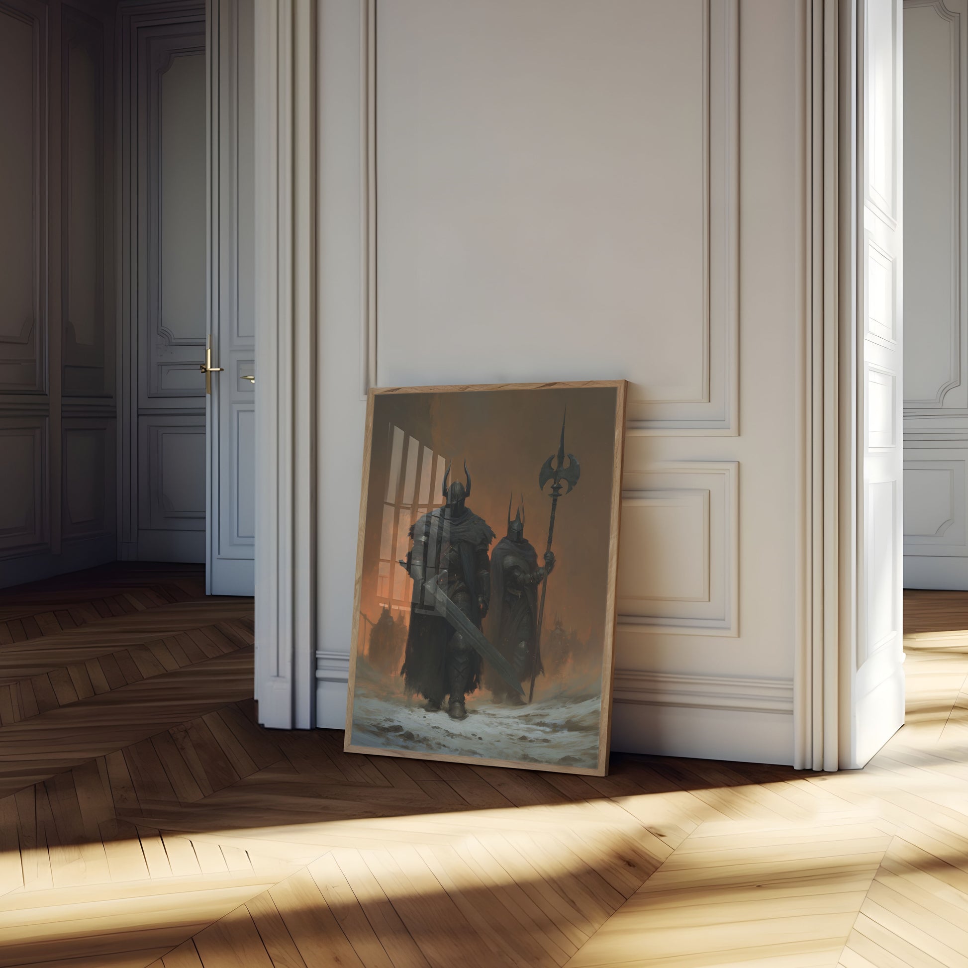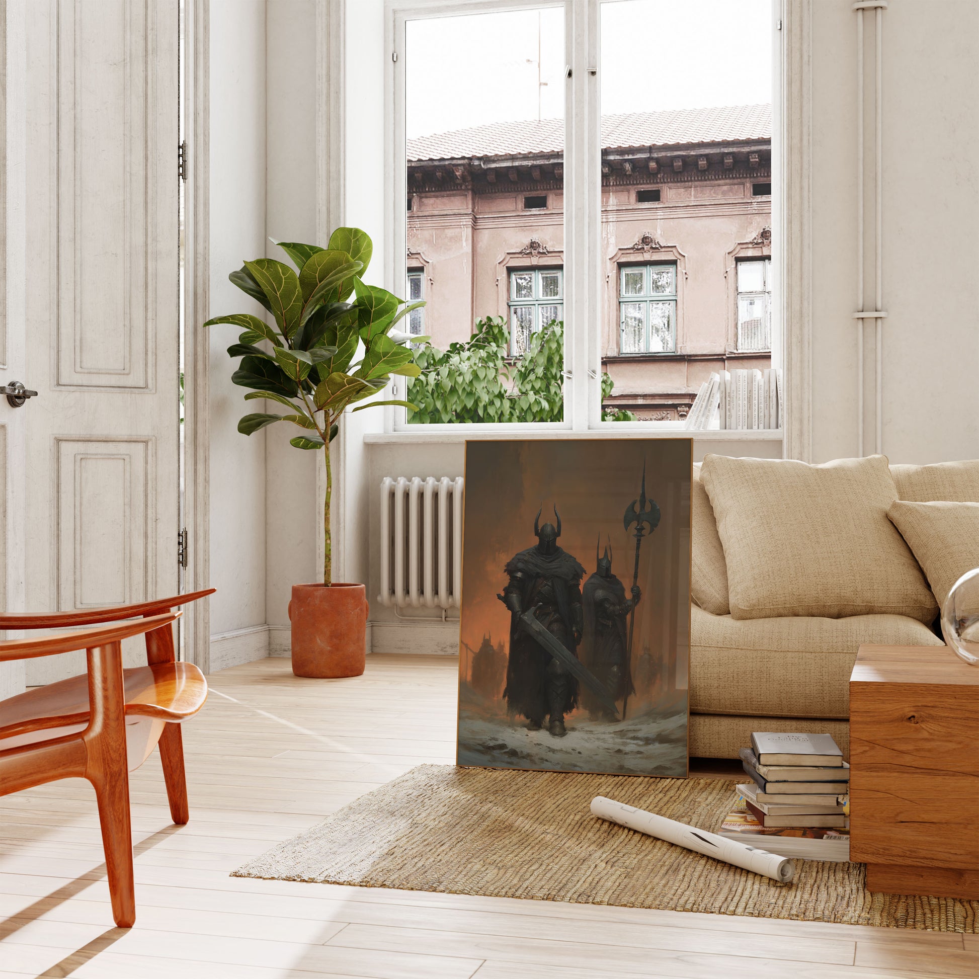 Two imposing armored knights stand against a haunting orange-tinted landscape, their silhouettes radiating an epic sense of medieval darkness and power. Adorned with horned helmets and flowing cloaks, these warriors emerge from misty terrain, wielding a massive sword and an ornate battle axe, creating an atmosphere of mythical strength and ominous mystery.