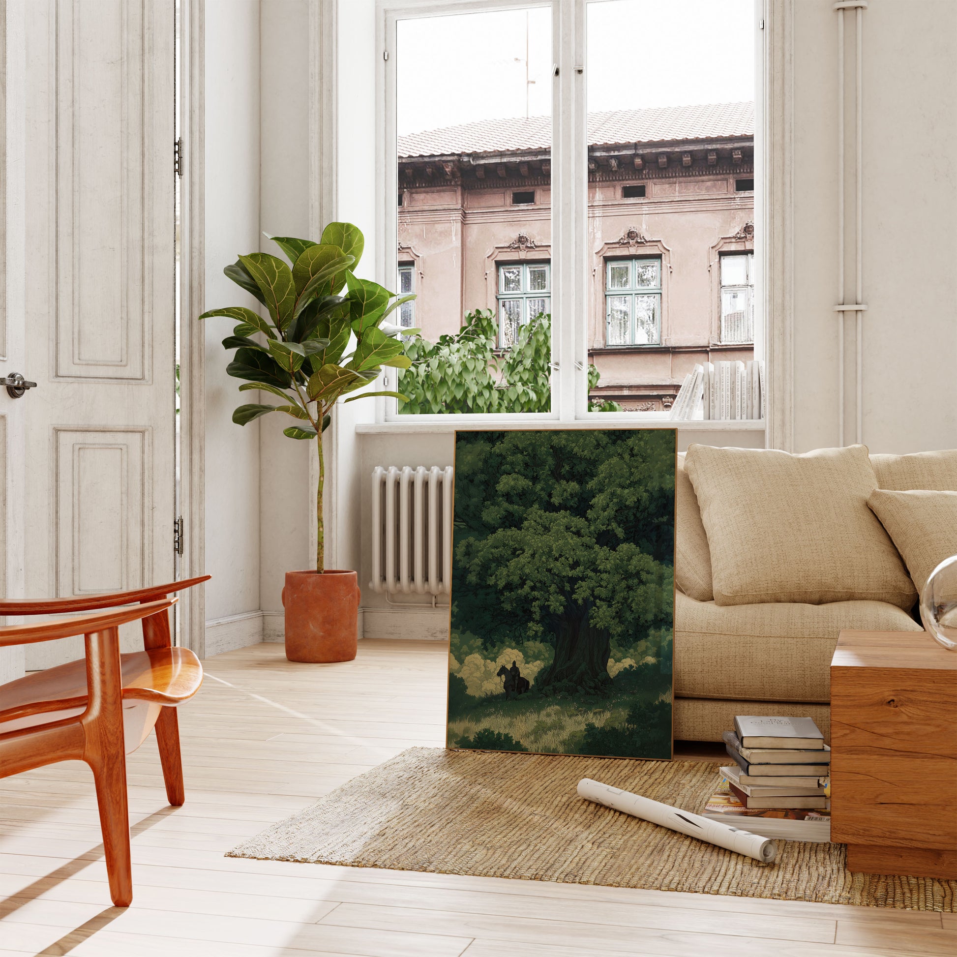 A mysterious rider on horseback sits silently beneath an ancient, massive tree with lush green foliage. The scene captures a moment of quiet solitude, with soft white cloud formations surrounding the dark silhouettes in a verdant, mystical landscape. Dark and enigmatic, this artwork evokes a sense of medieval fantasy and natural wonder.