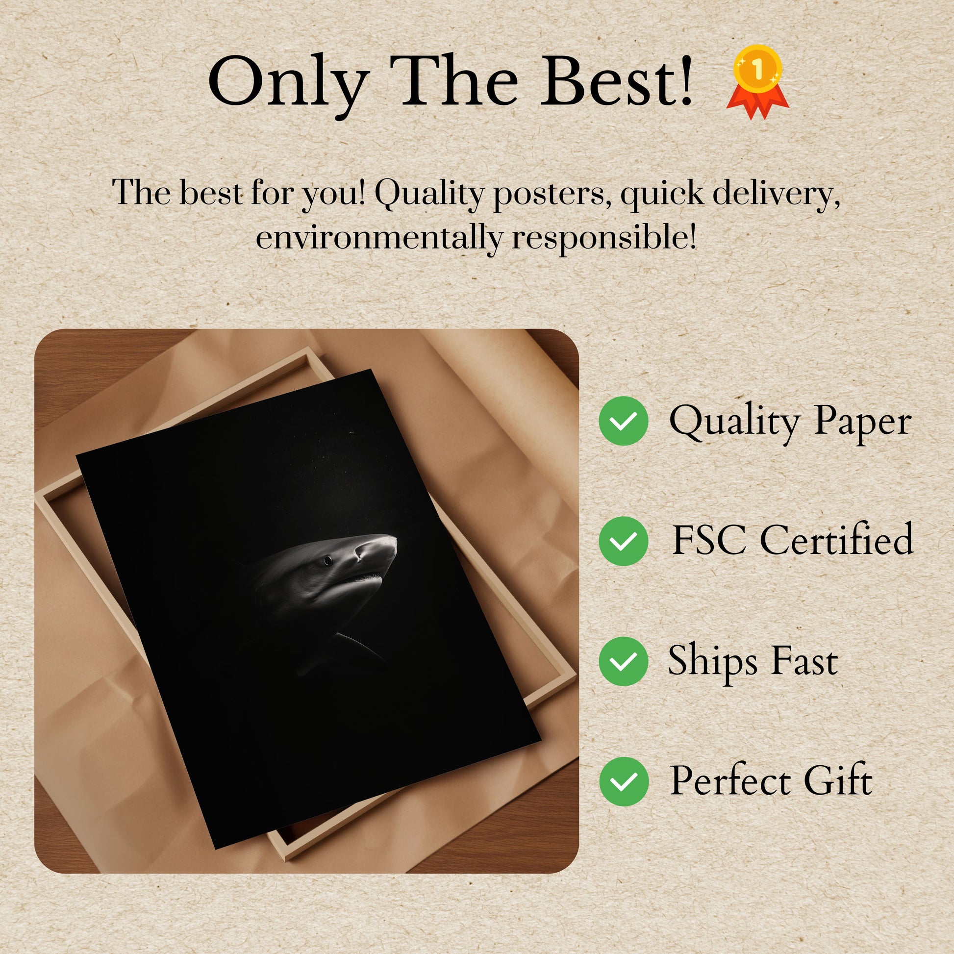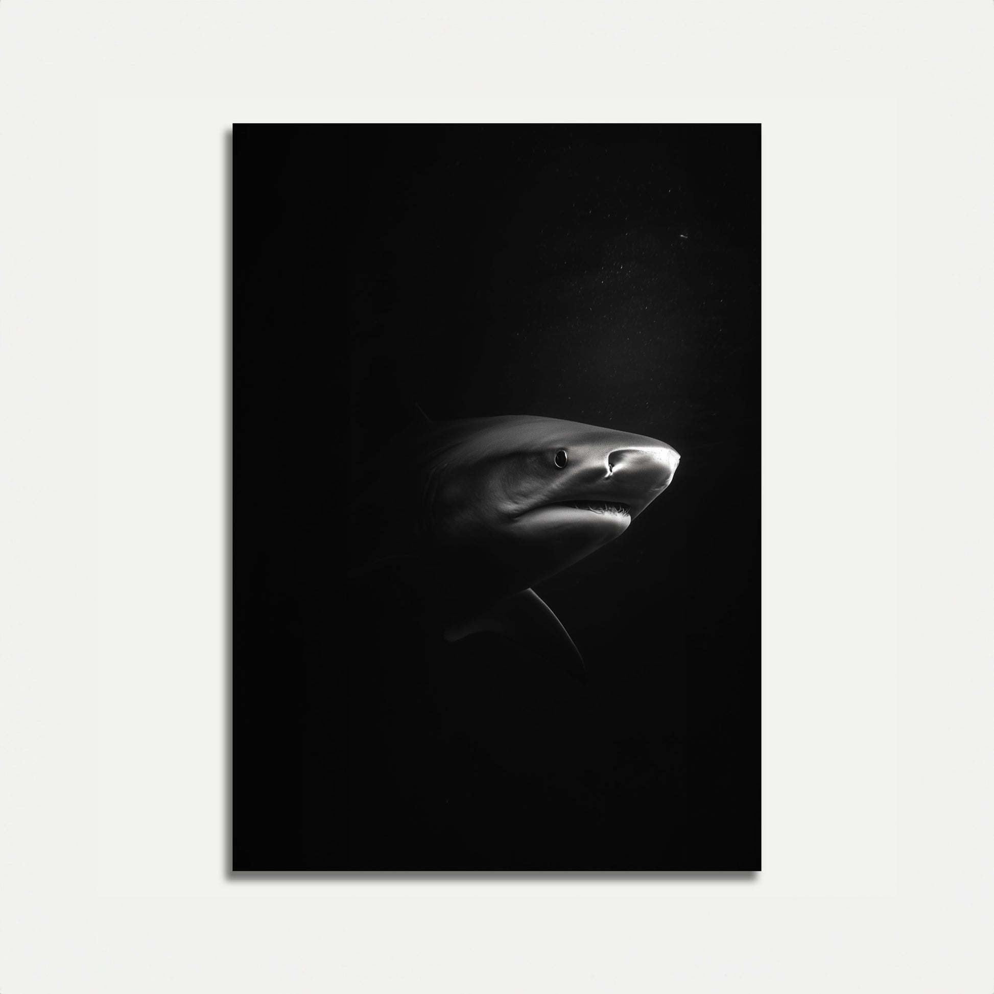Dive into the mysterious depths with this stunning black and white great white shark portrait. Emerging from inky darkness, the shark's sleek silhouette captures the raw power and elegance of nature's most feared marine hunter. The dramatic lighting highlights every contour, creating an intense and captivating visual experience that will command attention in any space.