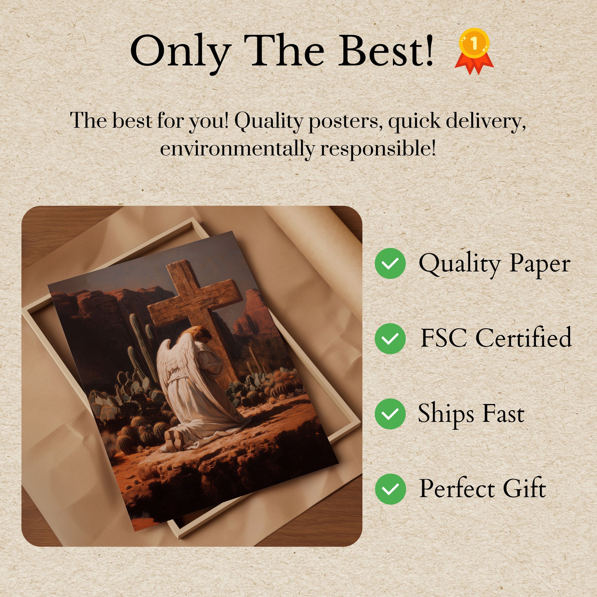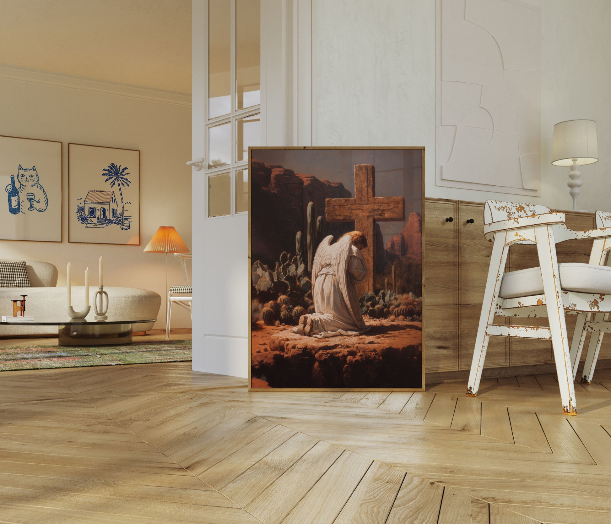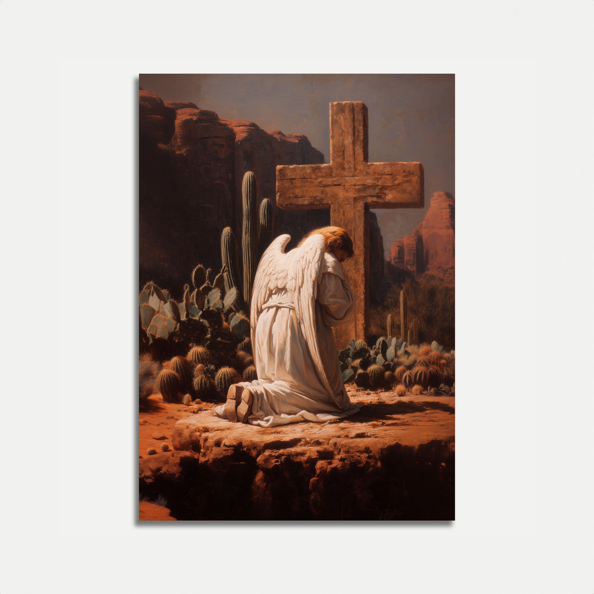 A serene and contemplative scene of an angel kneeling in reverence before a wooden cross, surrounded by the rugged beauty of a desert landscape. Cacti and rocky formations create a stark, spiritual backdrop that evokes deep emotional reflection and quiet meditation.