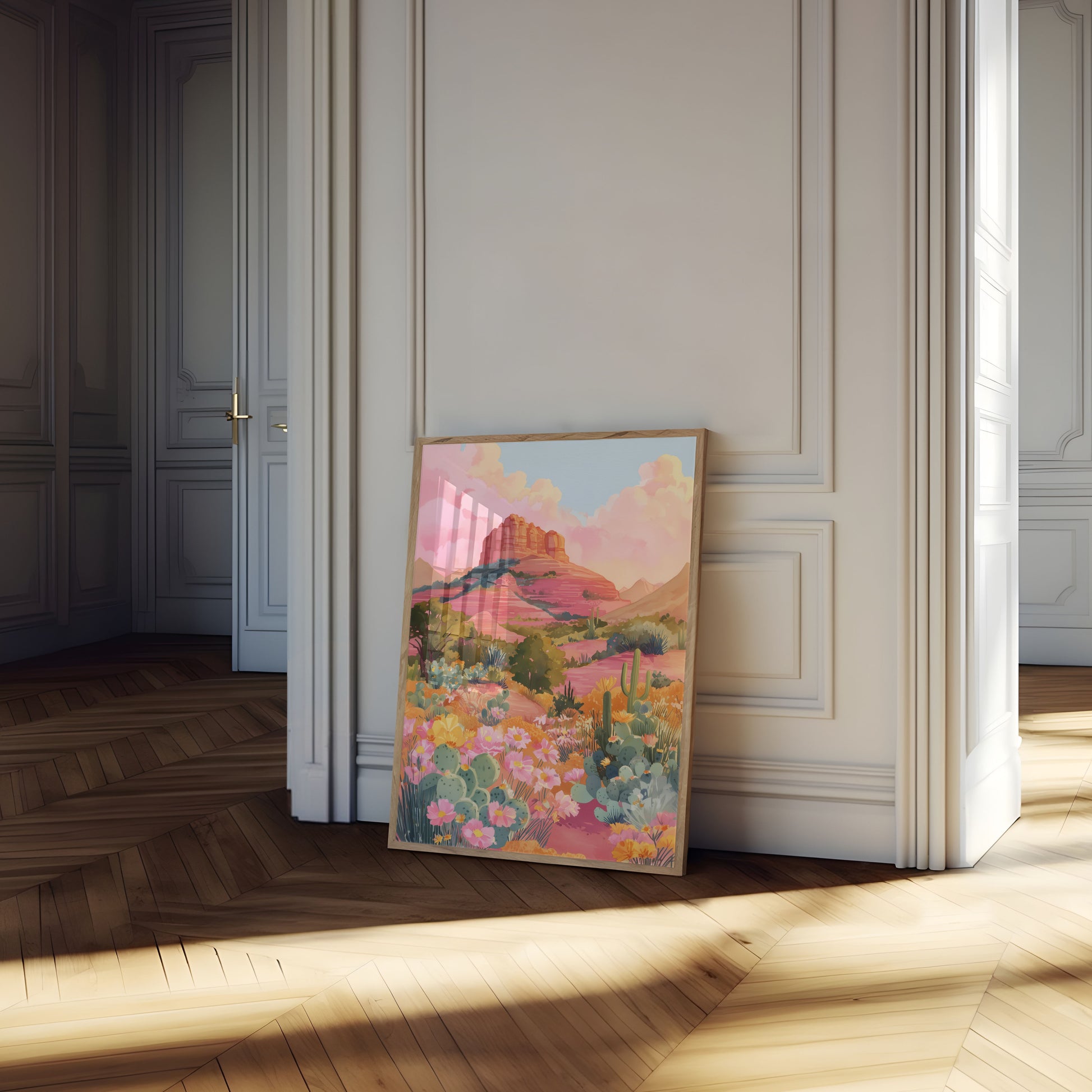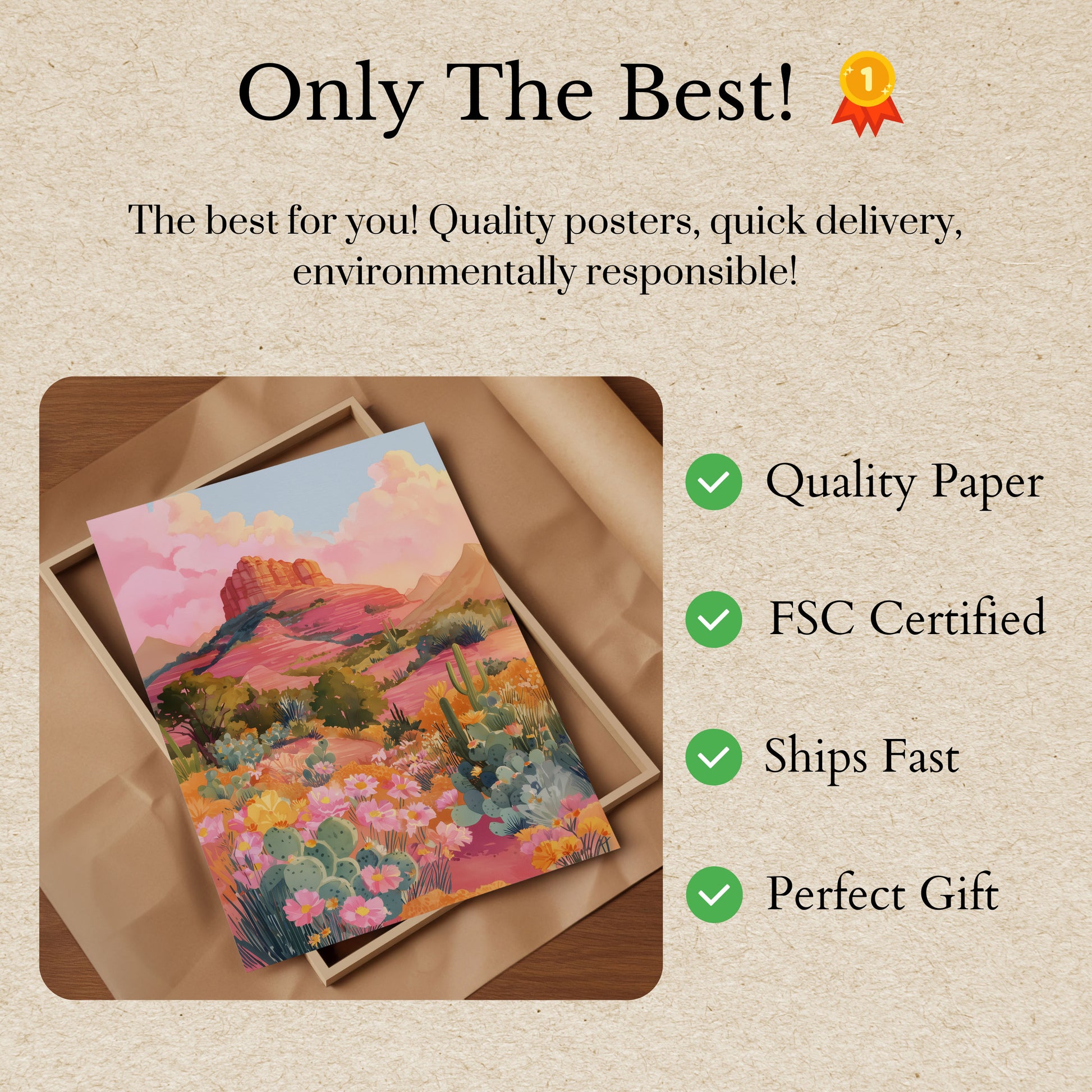Experience the breathtaking beauty of a desert landscape bursting with vibrant colors and life. This stunning poster captures the essence of a Southwestern landscape, featuring a majestic red rock formation surrounded by a lush array of blooming cacti, wildflowers, and golden sunset hues. The dreamy pink and orange sky creates a magical atmosphere that transports you to the serene and beautiful desert wilderness.