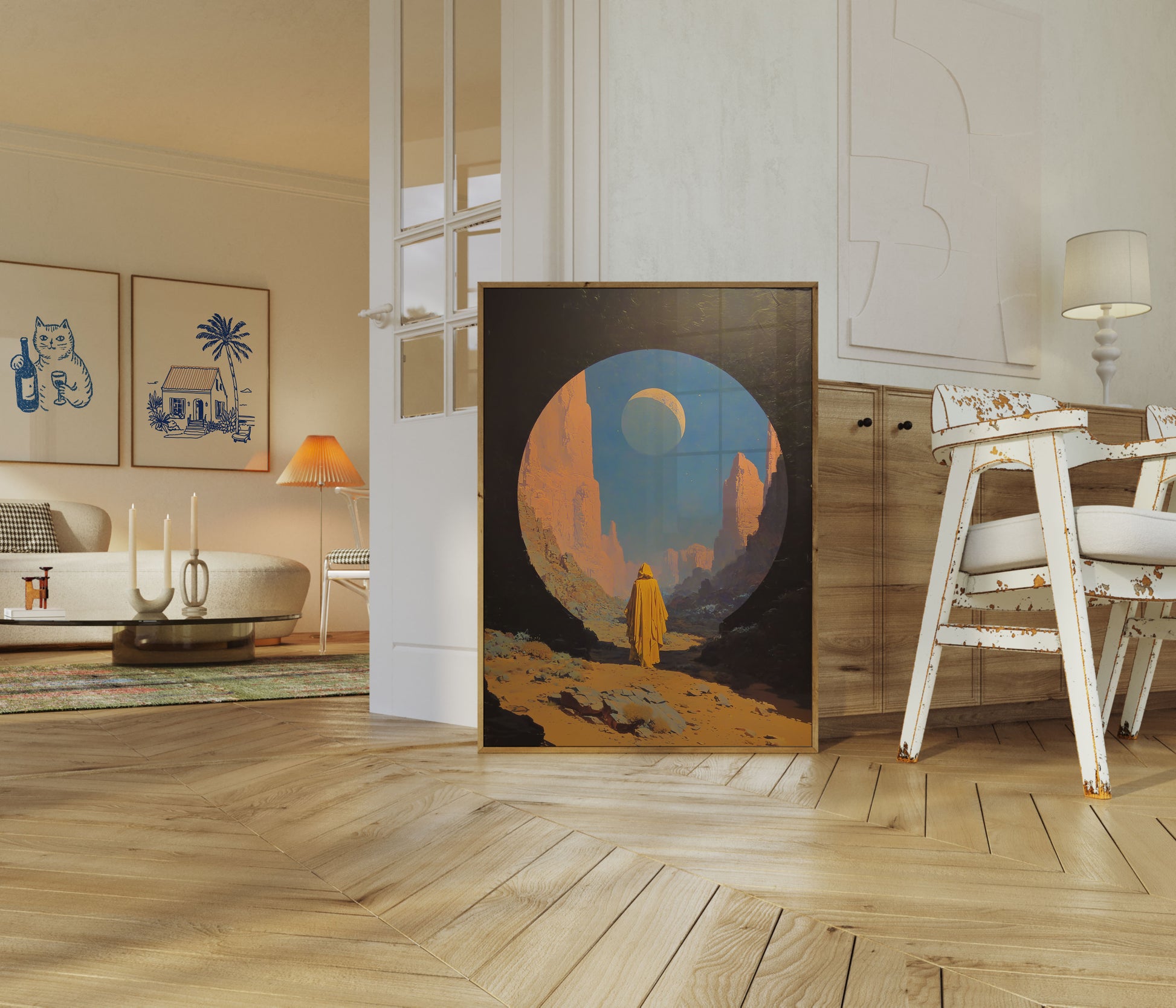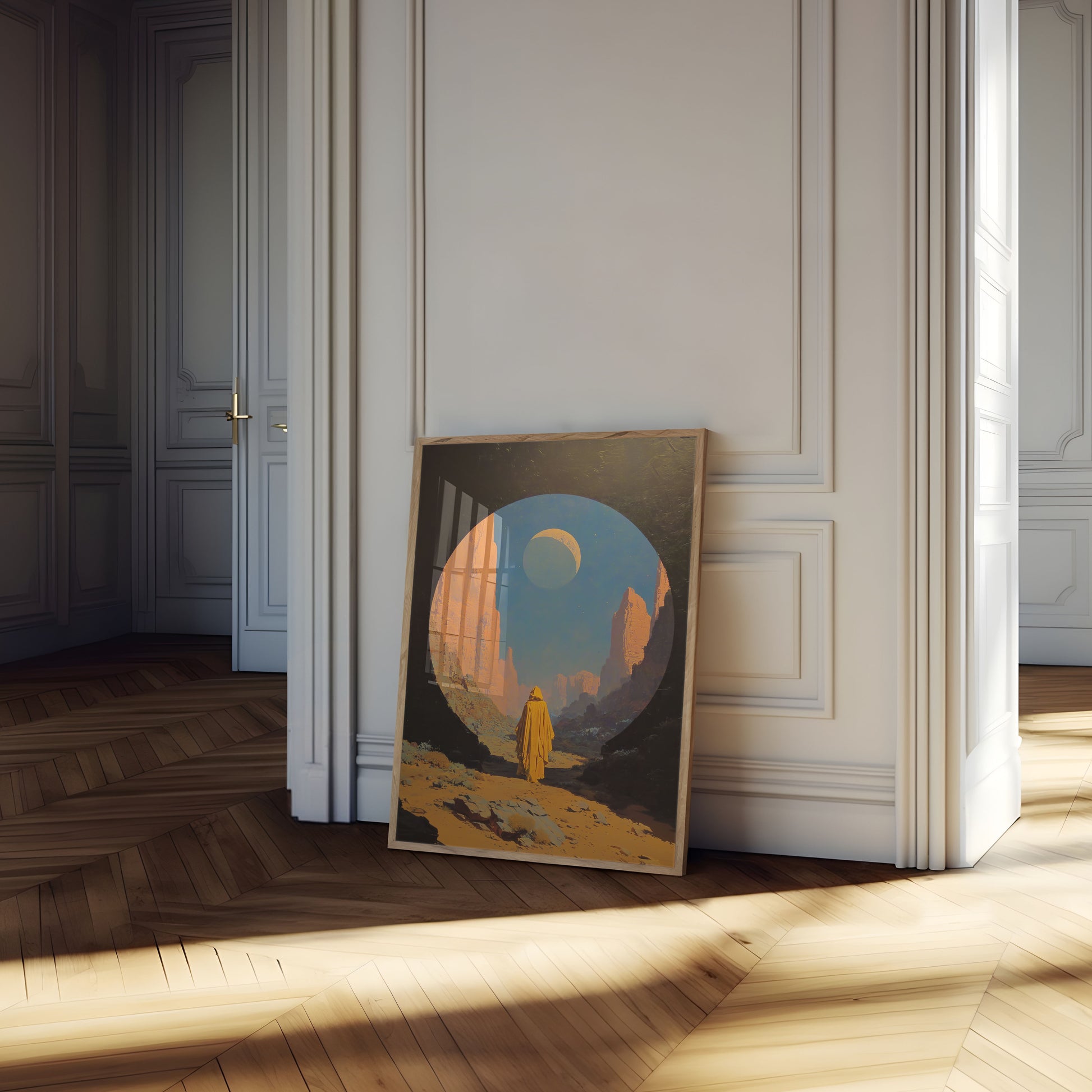 Step into a transcendent desert landscape where ancient rock formations frame a celestial wonder. This breathtaking artwork captures a figure in golden robes standing before a mesmerizing lunar eclipse, gazing at a crescent moon suspended in an azure sky. The warm terracotta and burnt orange tones of the towering canyon walls create a stunning contrast with the cool blue heavens above, evoking a sense of spiritual contemplation and awe-inspired solitude. The composition draws you into a moment of profound connection between earth and cosmos, where time seems to stand still.