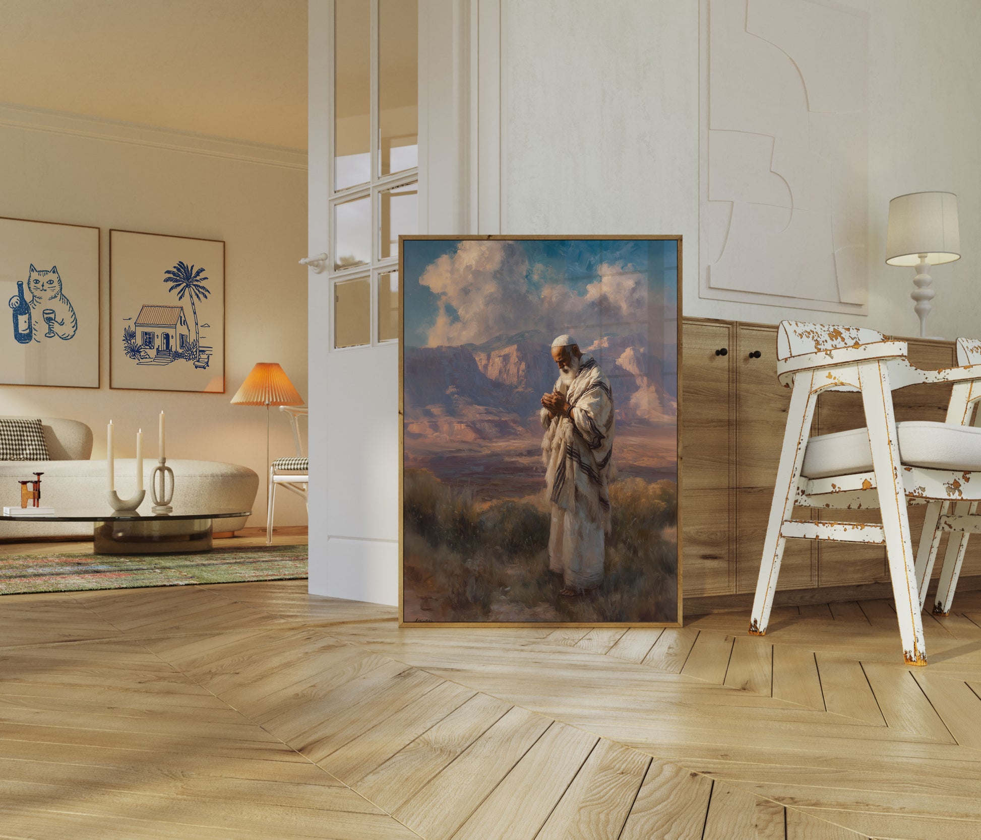 A serene portrait of an elderly figure in traditional white robes, standing in quiet contemplation against a dramatic desert mountain landscape. Soft, luminous clouds billow in the background, casting warm golden light across the rugged terrain, creating a sense of spiritual tranquility and timeless connection to the natural world.