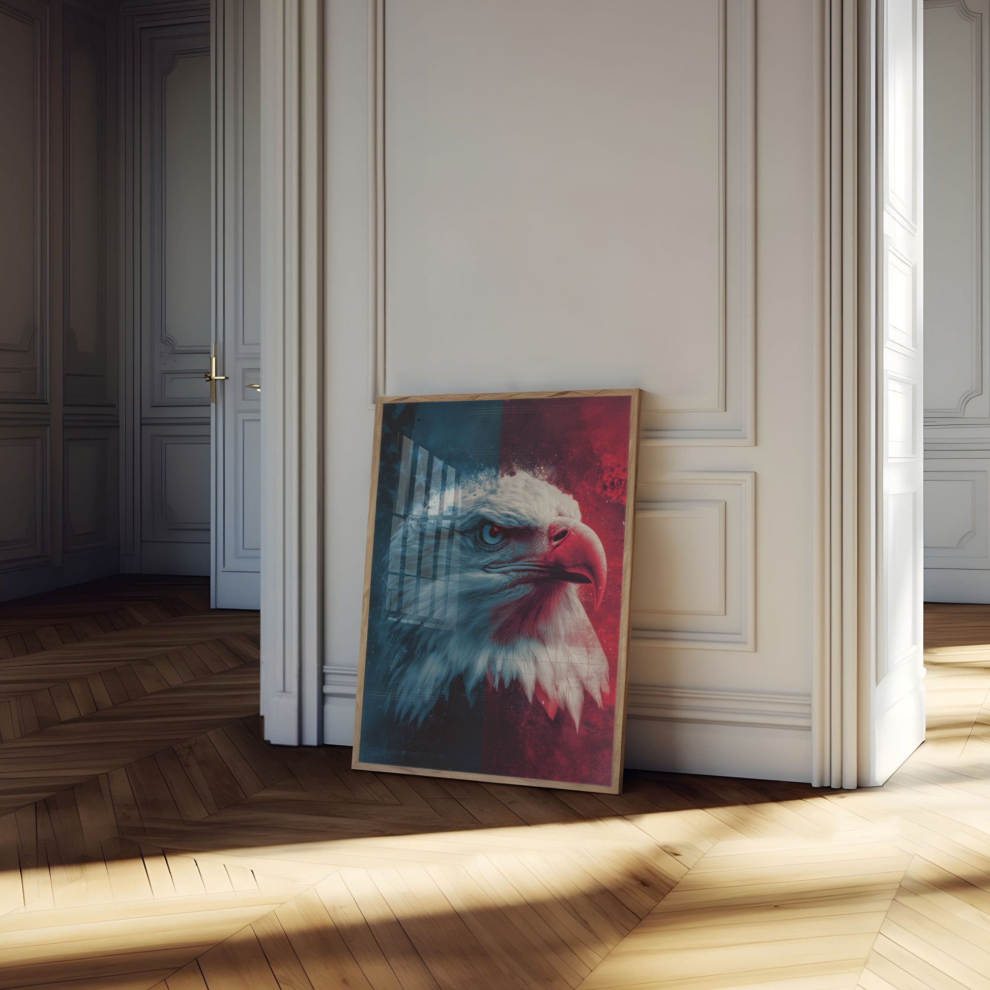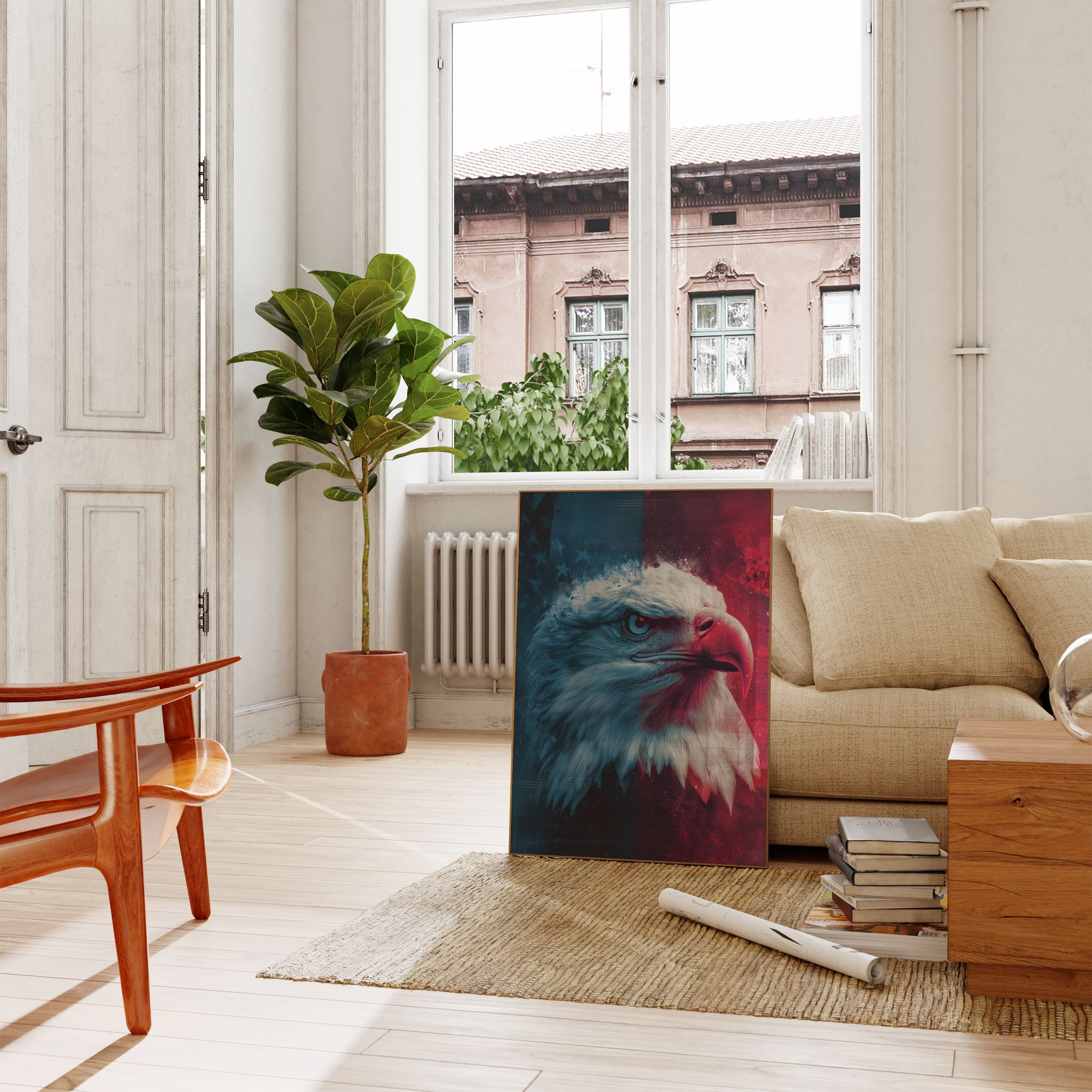 A striking visual representation of national duality, this eagle poster captures the intense symbolism of unity and division. The majestic bird is split between cool blue and passionate red, with intricate feather details and a piercing gaze that commands attention. Its powerful composition reflects the complex nature of national identity and symbolic representation.