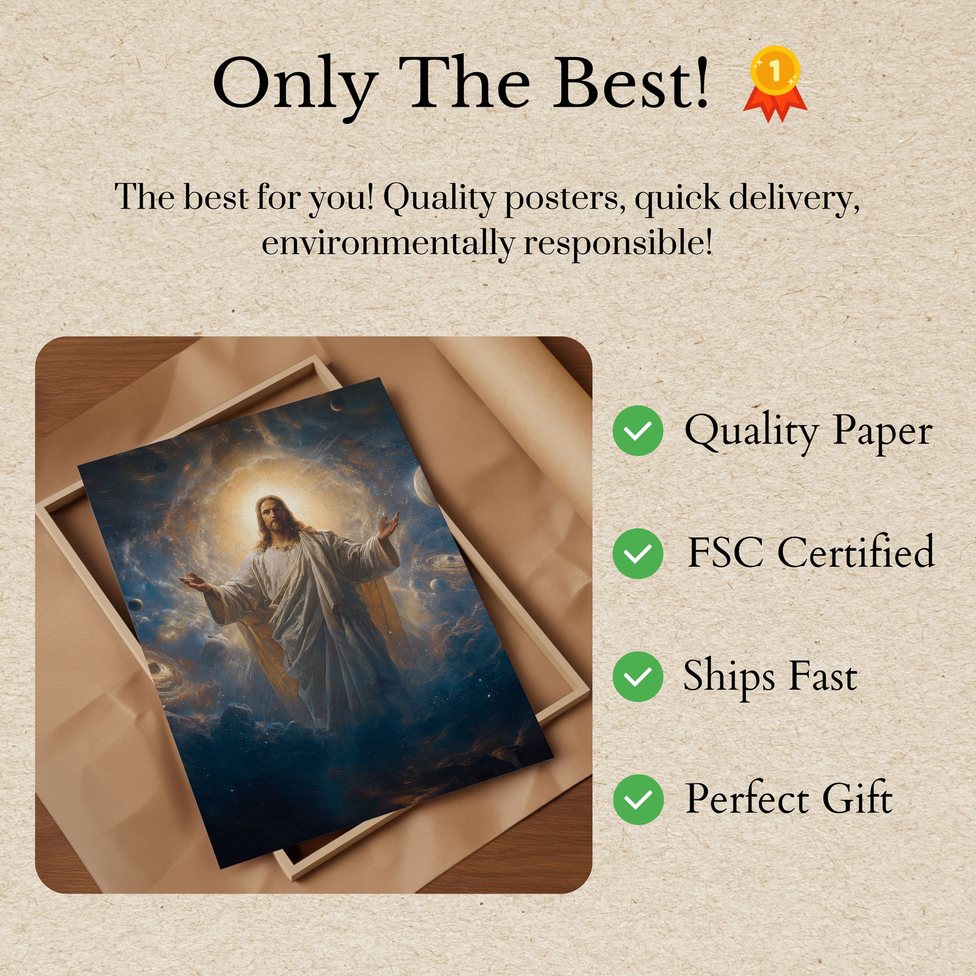 A breathtaking celestial portrait depicting a radiant figure in luminous white robes, surrounded by an ethereal golden light and cosmic landscapes. Planets, galaxies, and starry nebulae create a magnificent backdrop, symbolizing divine universal presence and transcendent power. The artwork captures a moment of spiritual majesty, with outstretched arms revealing strength and compassion against the infinite cosmic canvas.
