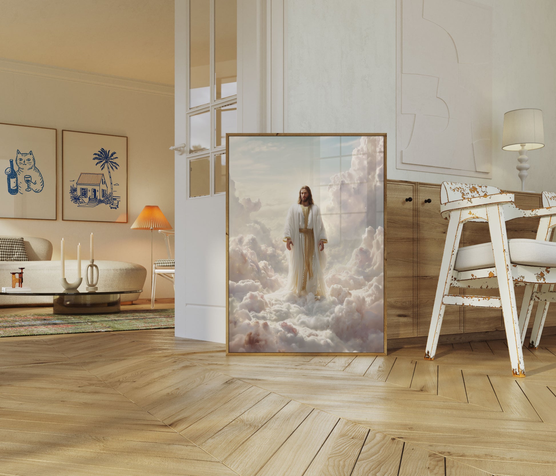 Experience a transcendent moment with this ethereal poster depicting a serene figure standing majestically amidst soft, billowing clouds. Bathed in radiant light and adorned in pristine white robes with golden embellishments, the image captures a sublime spiritual essence that evokes peace and reverence. The delicate cloud formations and luminous background create a sense of tranquility and divine presence.