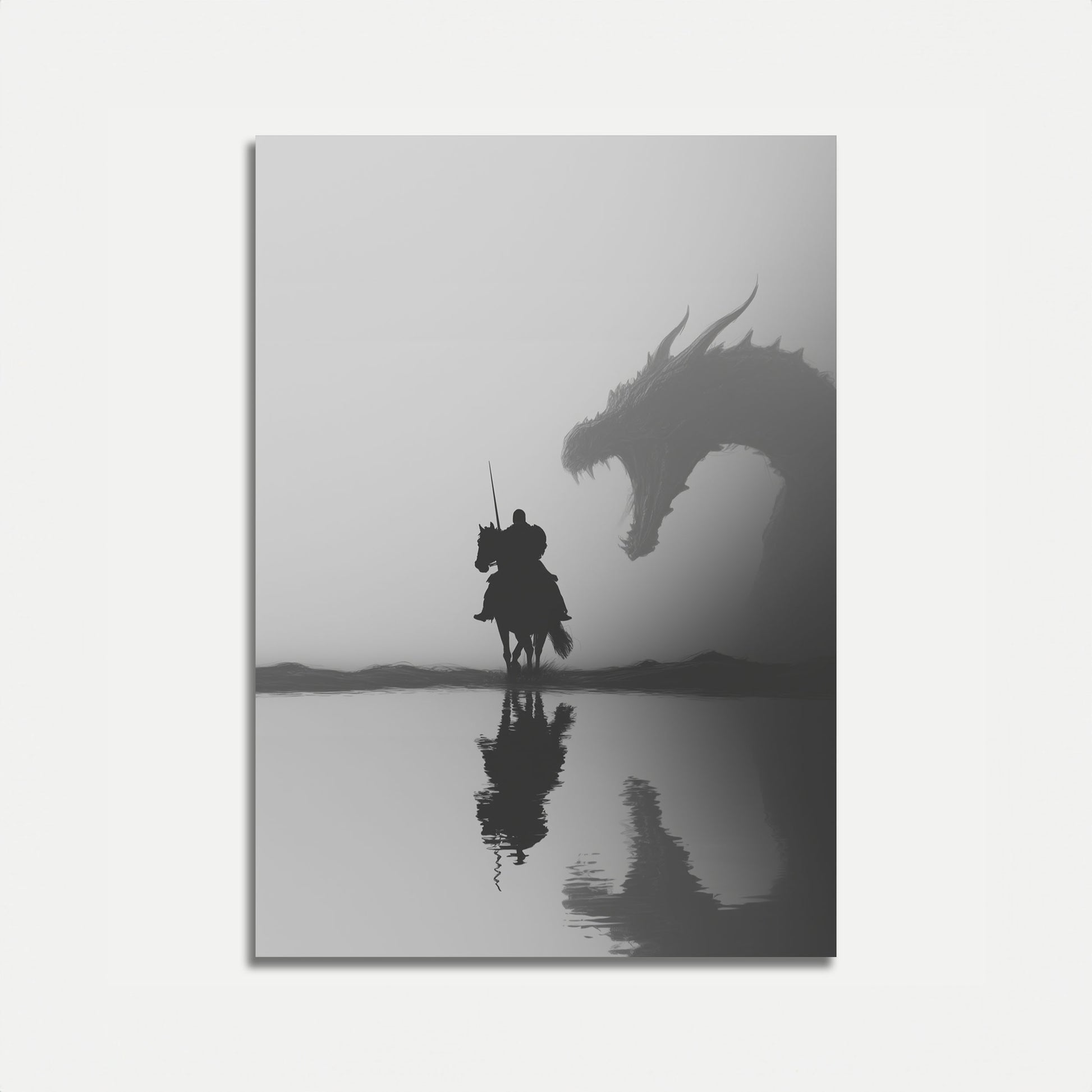 A haunting black and white artwork depicting an epic encounter between a mounted knight and a massive dragon. Silhouetted against a misty, atmospheric background, the scene captures a moment of intense tension reflected in still waters. The dramatic composition creates a sense of mythical confrontation and heroic challenge.