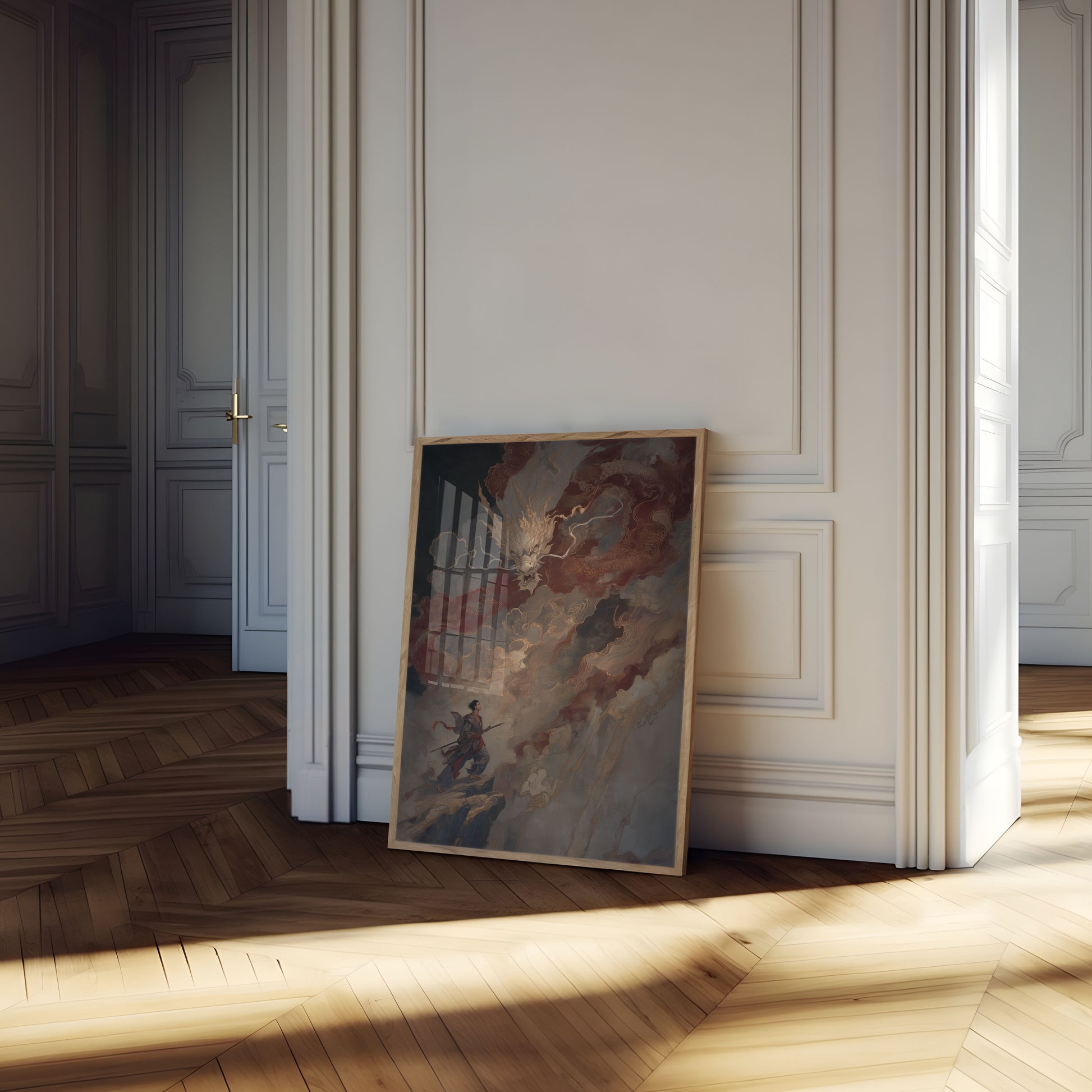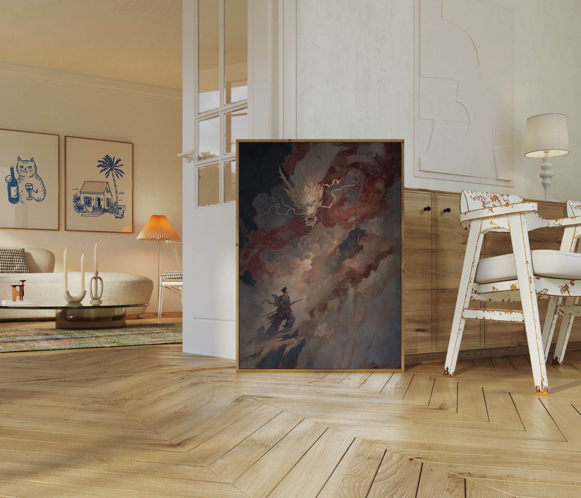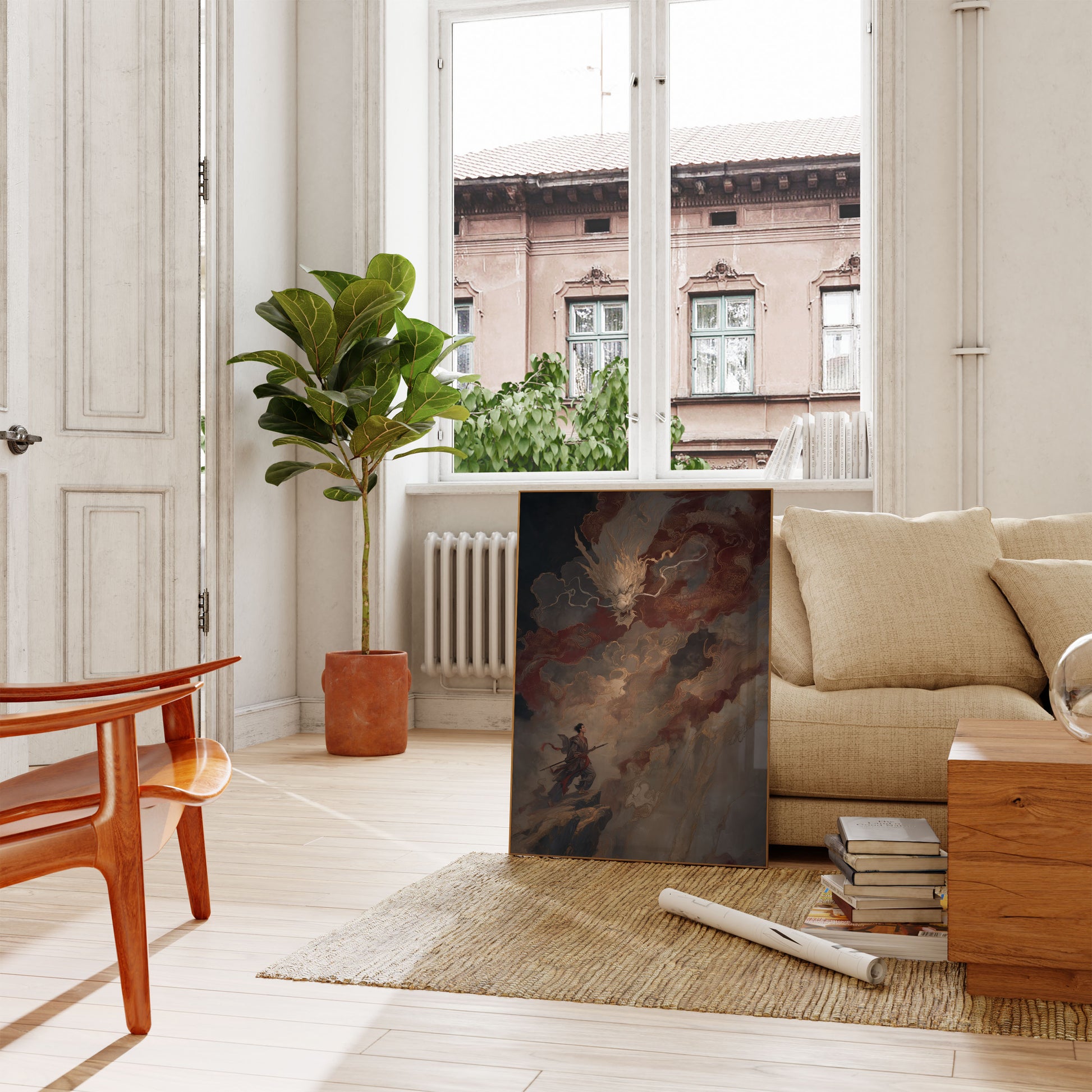 Immerse yourself in a breathtaking confrontation between a lone warrior and an ethereal dragon spirit, set against a swirling landscape of crimson and ashen clouds. This mesmerizing artwork captures a moment of intense mythical drama, with the dragon's serpentine form erupting with supernatural energy and the warrior standing resolute on a rocky precipice. Rich in Eastern-inspired aesthetics, the painting blends dynamic movement, intricate details, and a powerful emotional intensity that draws viewers into its mystical narrative.