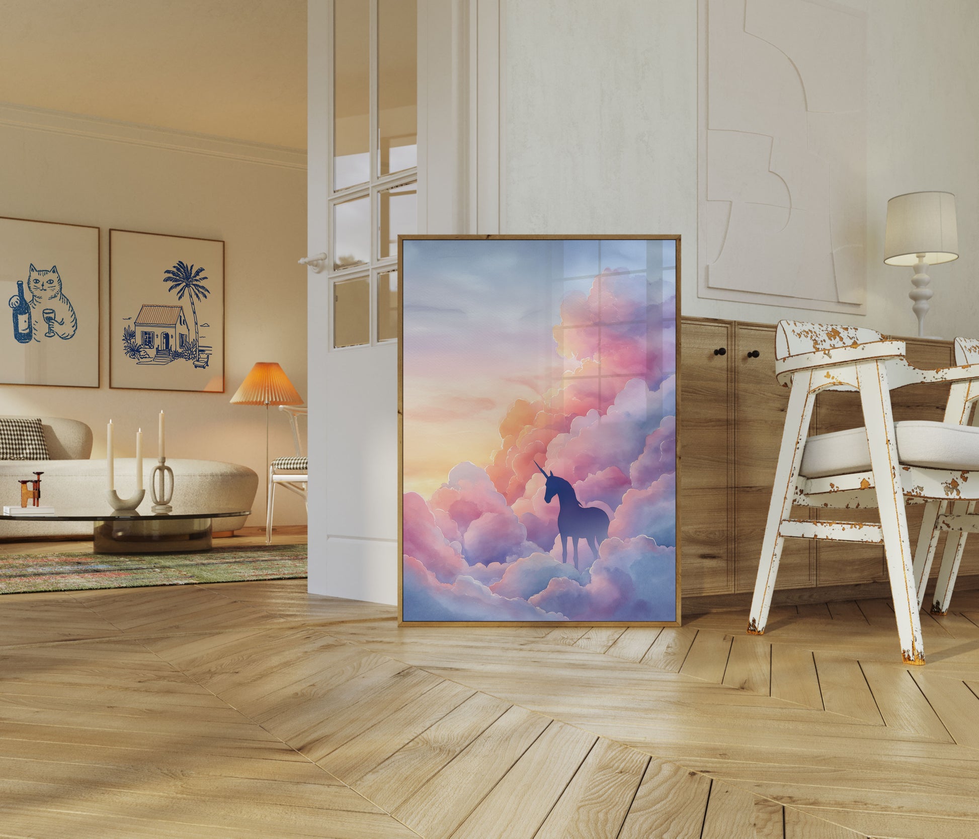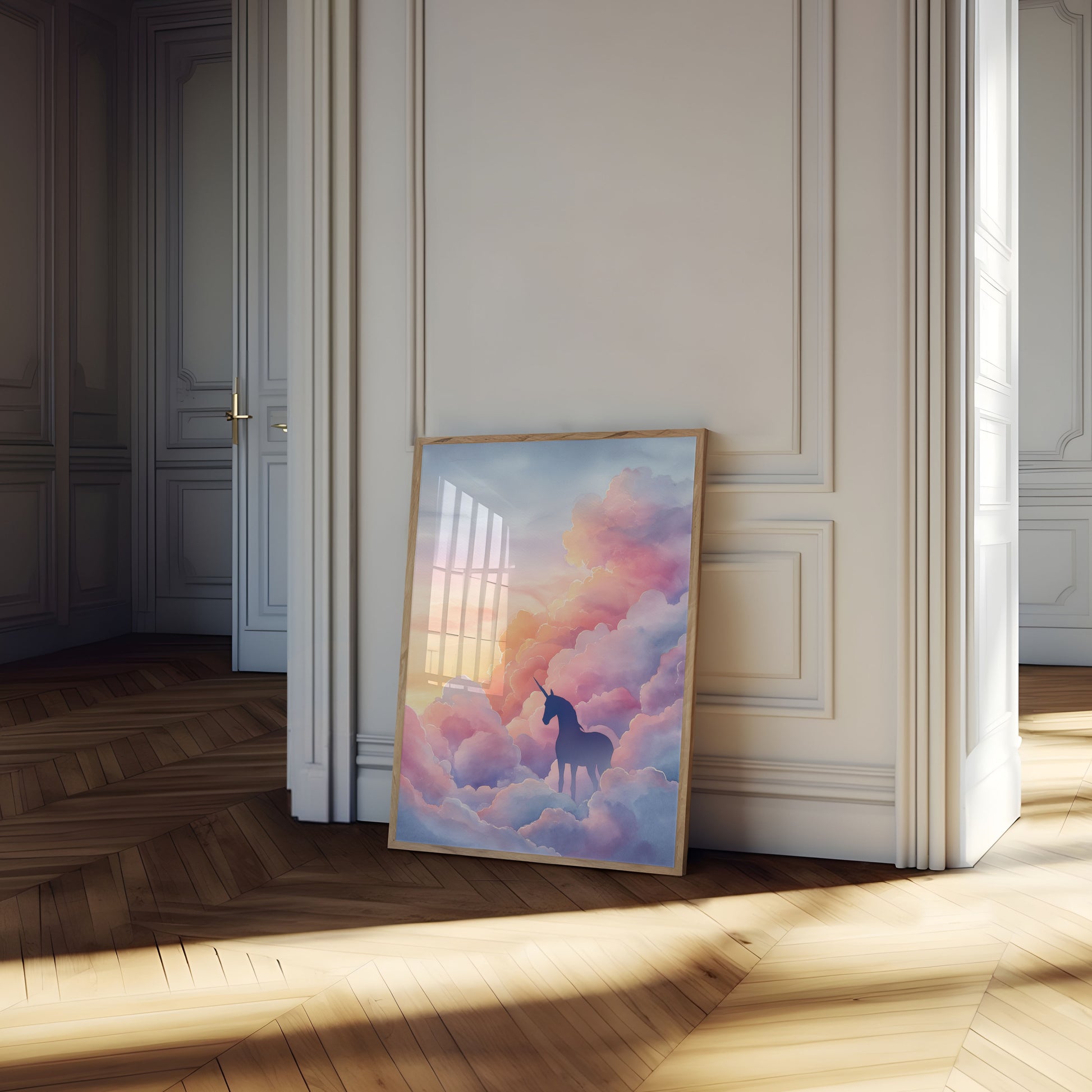 A magical silhouette of a unicorn stands majestically amidst a breathtaking sky of soft pastel clouds. Blending shades of pink, purple, and golden yellow create an ethereal sunset backdrop, evoking a sense of wonder and imagination. The deep blue unicorn emerges as a powerful, mysterious figure against the luminous, dreamy cloudscape.