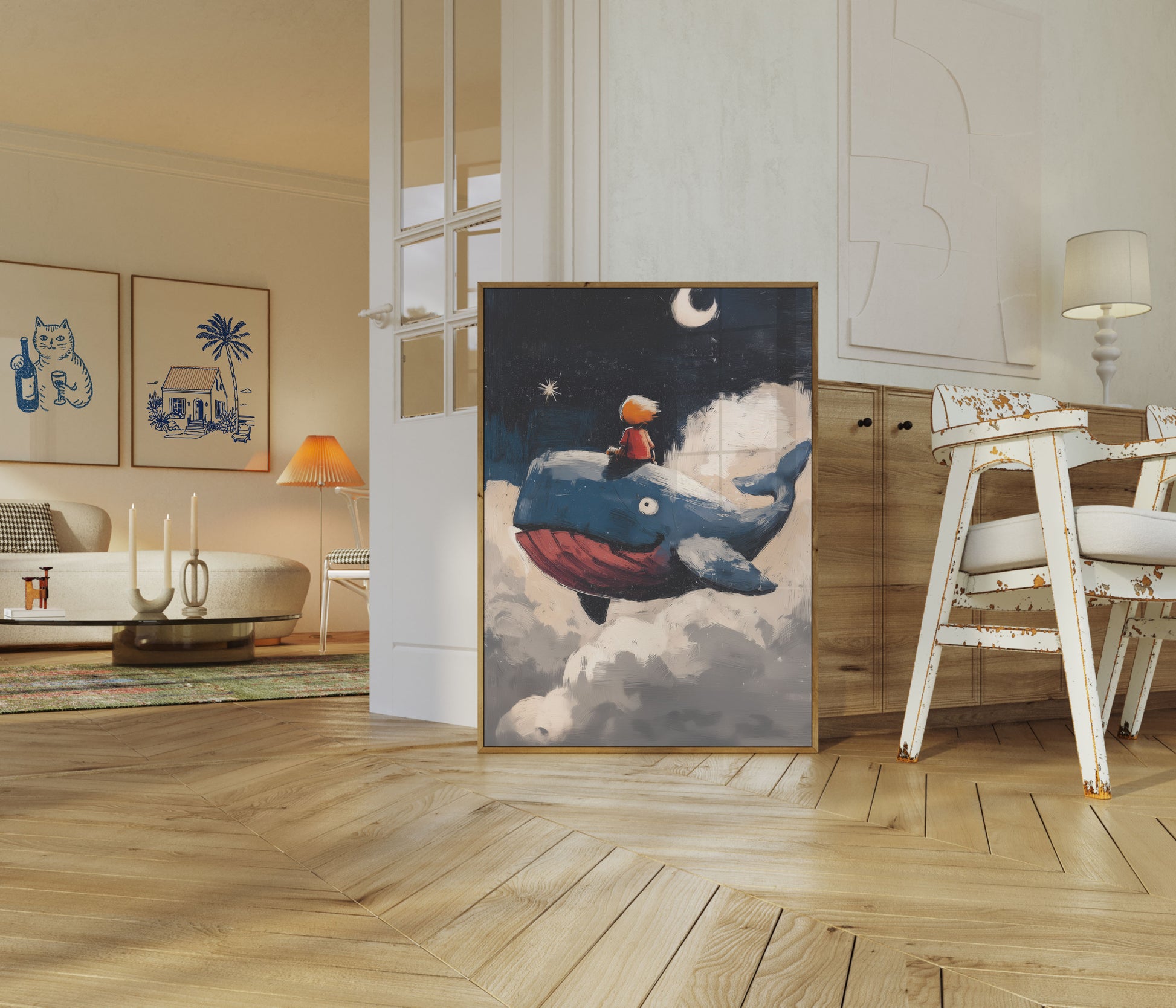 A magical nighttime scene unfolds as a small figure rides atop a friendly, smiling blue whale through starry skies. The soft, painterly style captures a sense of wonder and imagination, with delicate brushstrokes creating a dreamlike atmosphere of childhood adventure and exploration.