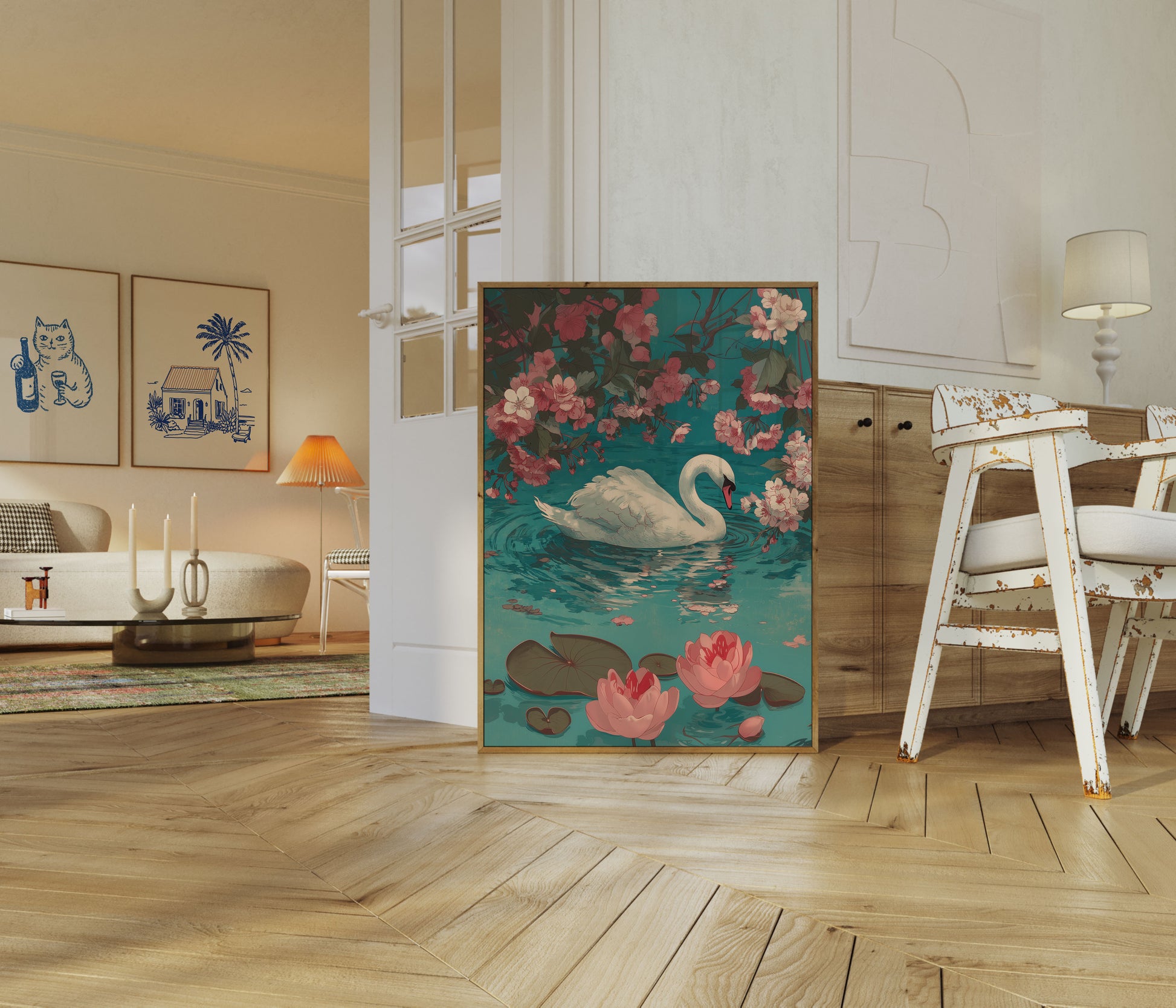 A breathtaking illustration of a pristine white swan gliding through a tranquil turquoise waterscape, surrounded by delicate pink cherry blossoms and soft water lilies. The artwork captures a serene moment of natural beauty, with intricate details and a dreamy color palette that transforms any room into a peaceful sanctuary.