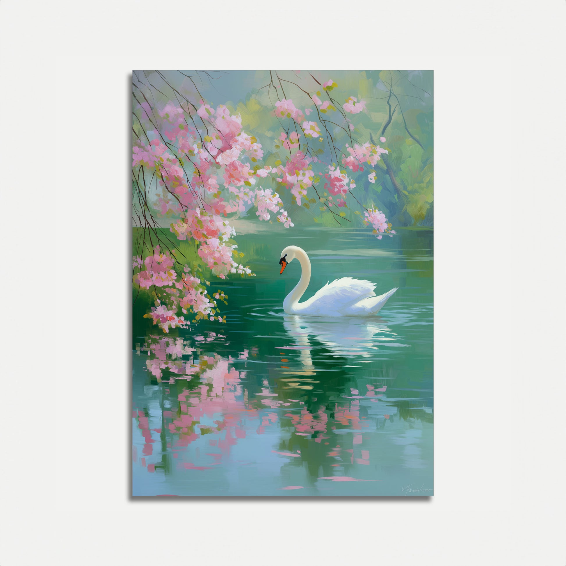 A serene watercolor painting captures a graceful white swan gliding through a tranquil lake, surrounded by soft pink cherry blossoms in full bloom. The delicate branches drape over the water, creating a mesmerizing reflection of pastel hues and gentle brushstrokes. This stunning artwork evokes a sense of peace and natural beauty that will transform any space.