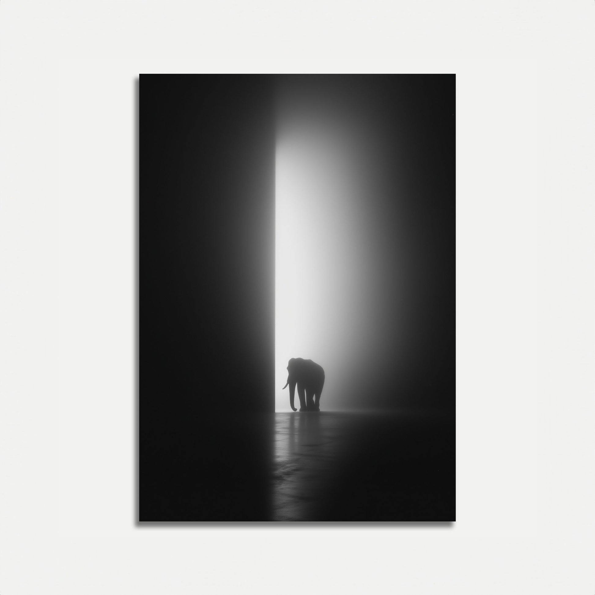 A mesmerizing black and white photograph captures a solitary elephant standing within a luminous vertical shaft of light. The stark contrast between deep shadows and brilliant radiance creates a profound sense of mystery and isolation. This haunting image transforms the majestic animal into a silhouette of contemplation and silent strength.