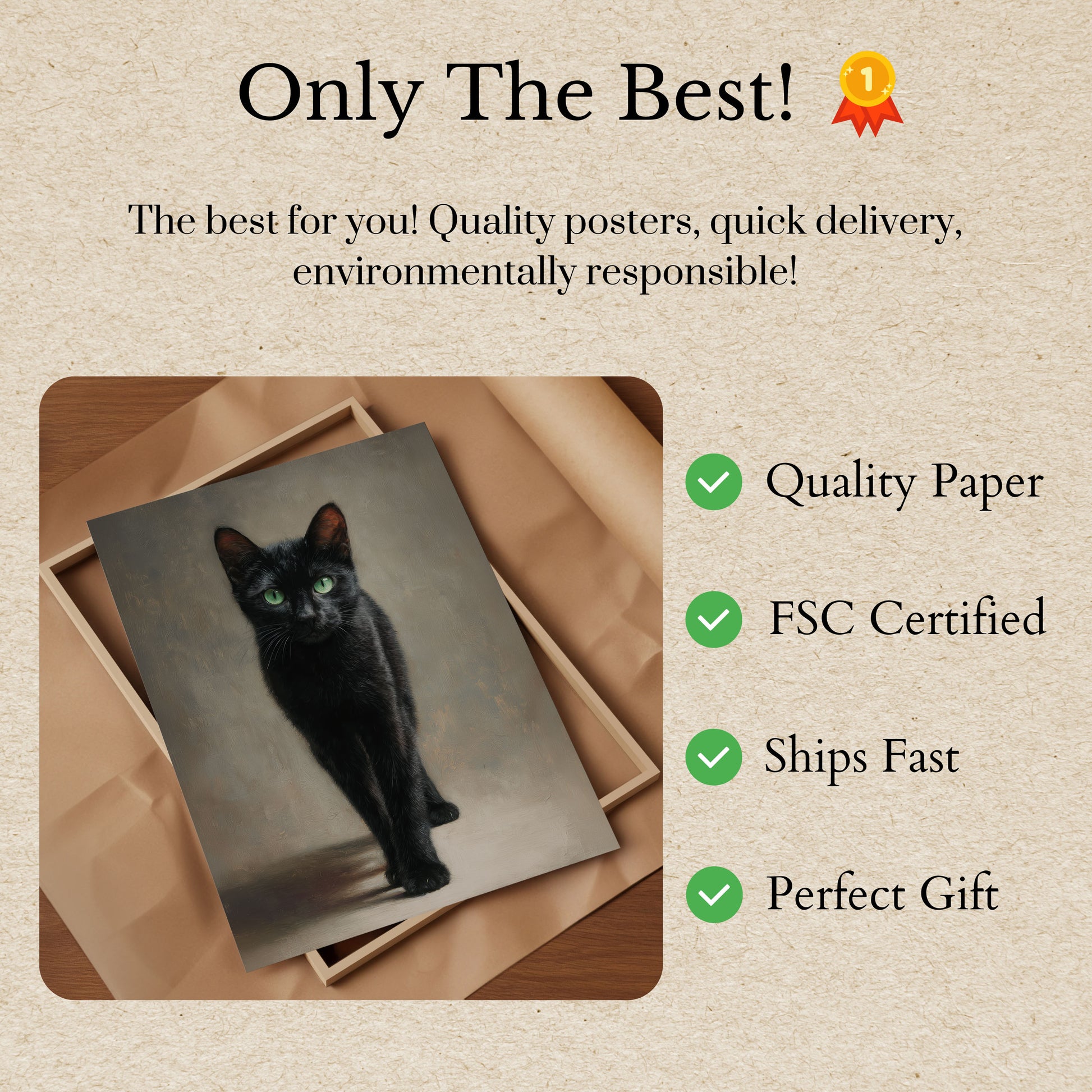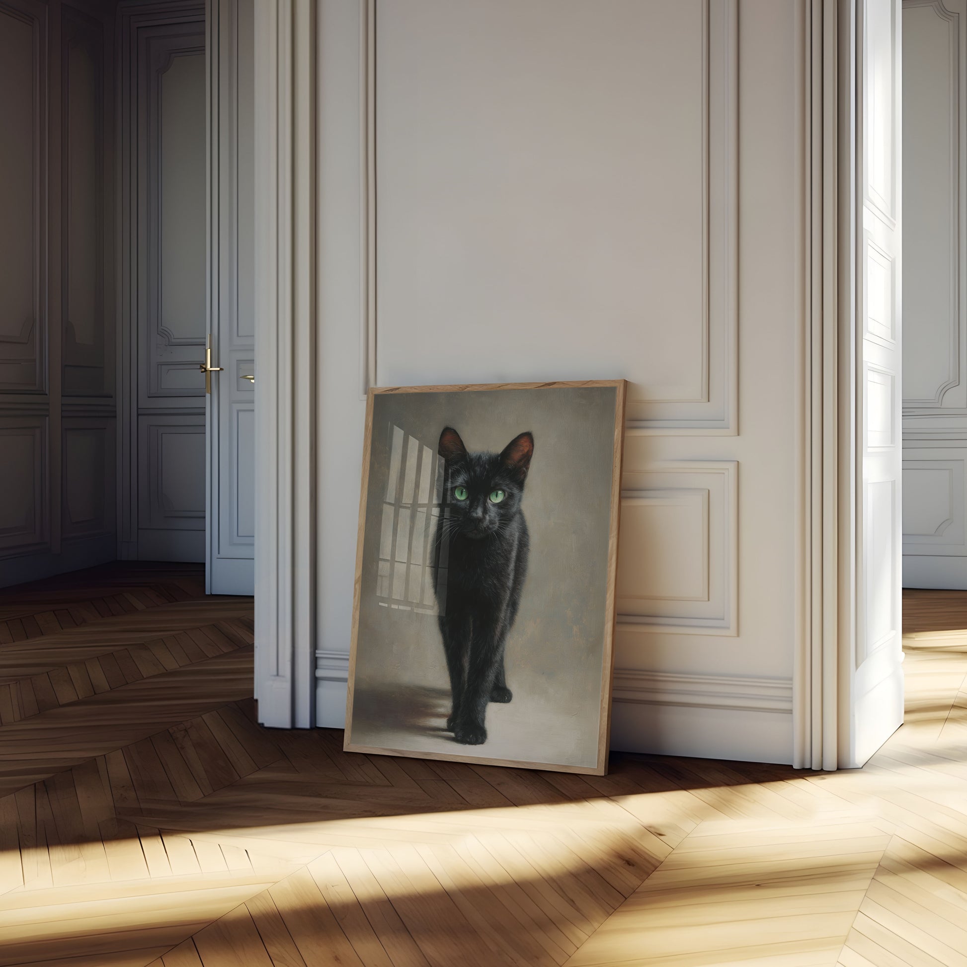 A stunning portrait of a sleek black cat with mesmerizing green eyes, captured in a soft, painterly style. The feline's intense gaze and luxurious fur create a captivating image that draws the viewer into its mysterious world. Painted with delicate brushstrokes, this artwork celebrates the elegant and enigmatic nature of black cats.