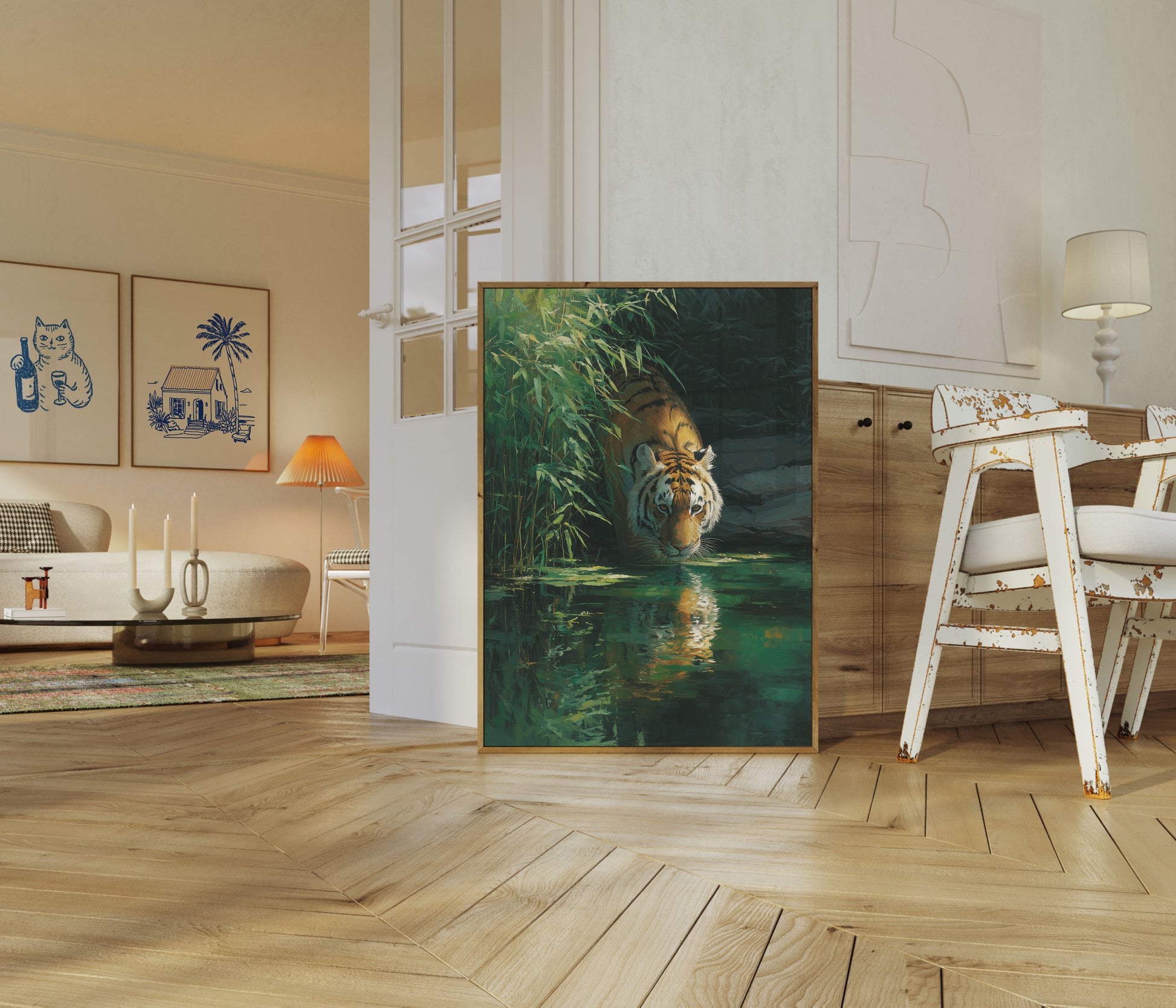 A majestic tiger emerges from lush bamboo foliage, drinking from a tranquil green pool that perfectly reflects its stunning orange and black striped coat. The artwork captures a breathtaking moment of wild beauty, with the tiger's intense gaze and the rich, layered greens creating an atmosphere of serene power and natural harmony. Every brushstroke in this Emerald Waters Tiger scene invites the viewer into a mesmerizing wilderness experience.