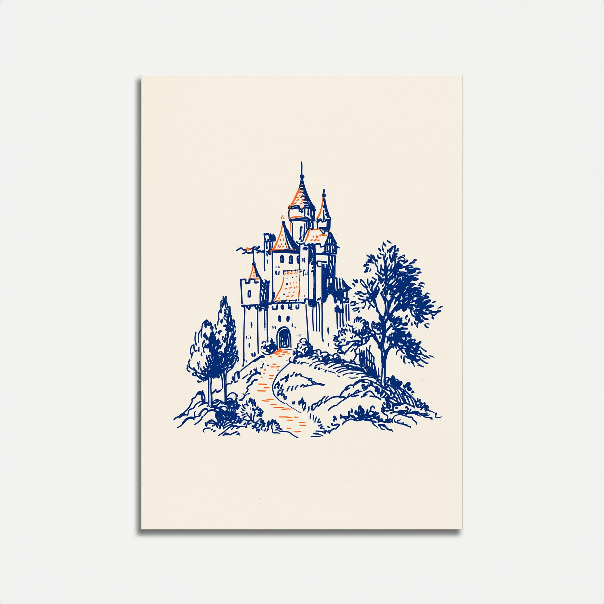 Step into a storybook world with this charming castle illustration rendered in classic blue and orange tones. This timeless artwork depicts a majestic fortress perched on a rocky hillside, surrounded by lush trees and winding pathways that lead to adventure. The vintage-inspired line work and hand-drawn aesthetic create a warm, nostalgic atmosphere perfect for inspiring imagination and transporting you to a magical realm of fantasy and wonder.