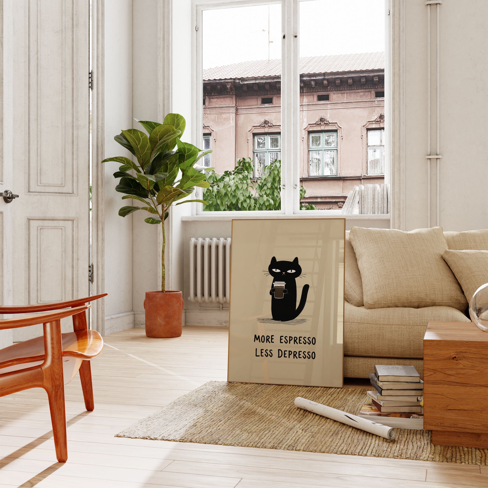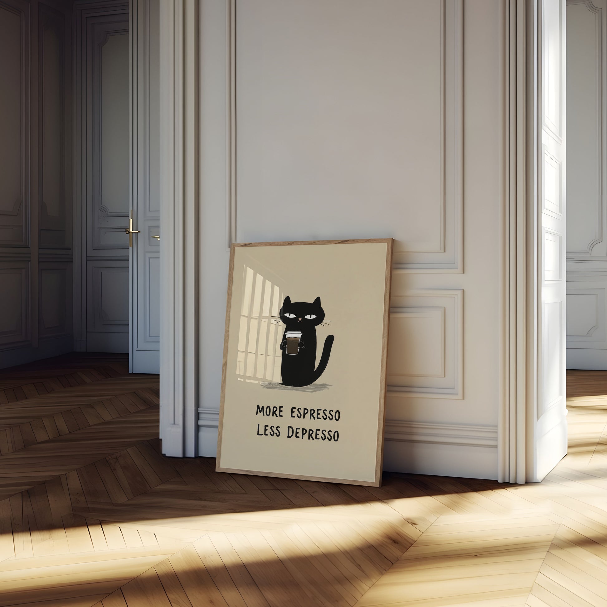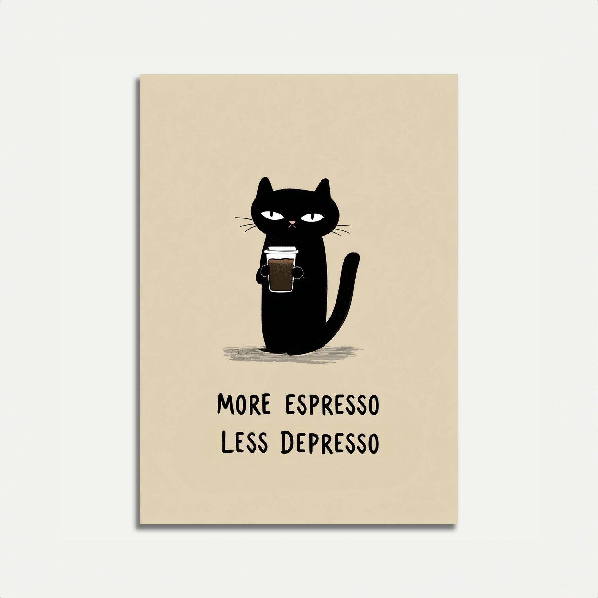 Meet the coolest coffee-loving feline in town! This charming black cat sits confidently with a to-go coffee cup, sporting an adorably grumpy expression that perfectly captures the mood of coffee enthusiasts everywhere. The minimalist design and witty 'More Espresso Less Depresso' text create a playful and relatable artwork that's sure to brighten up any coffee lover's space.