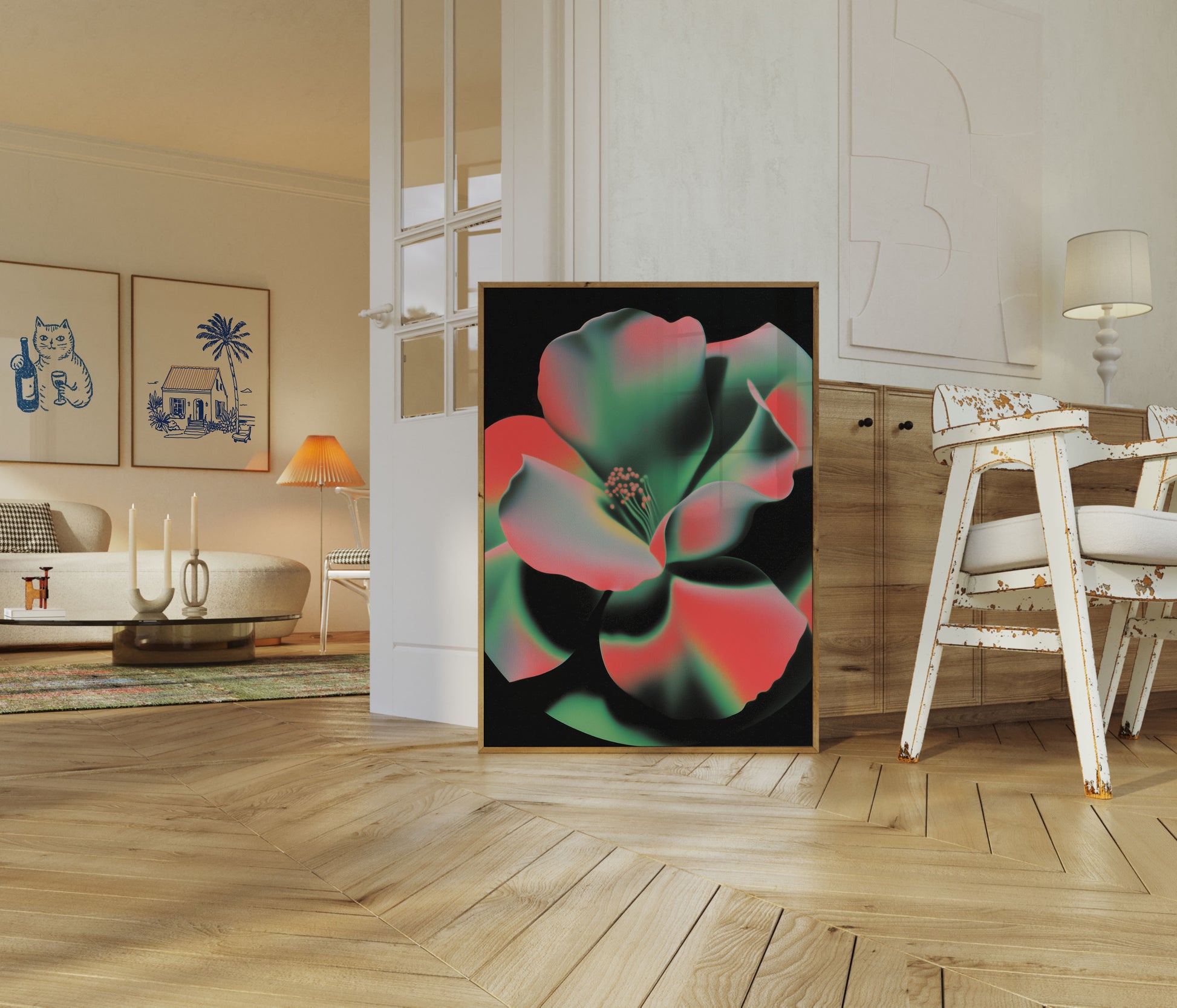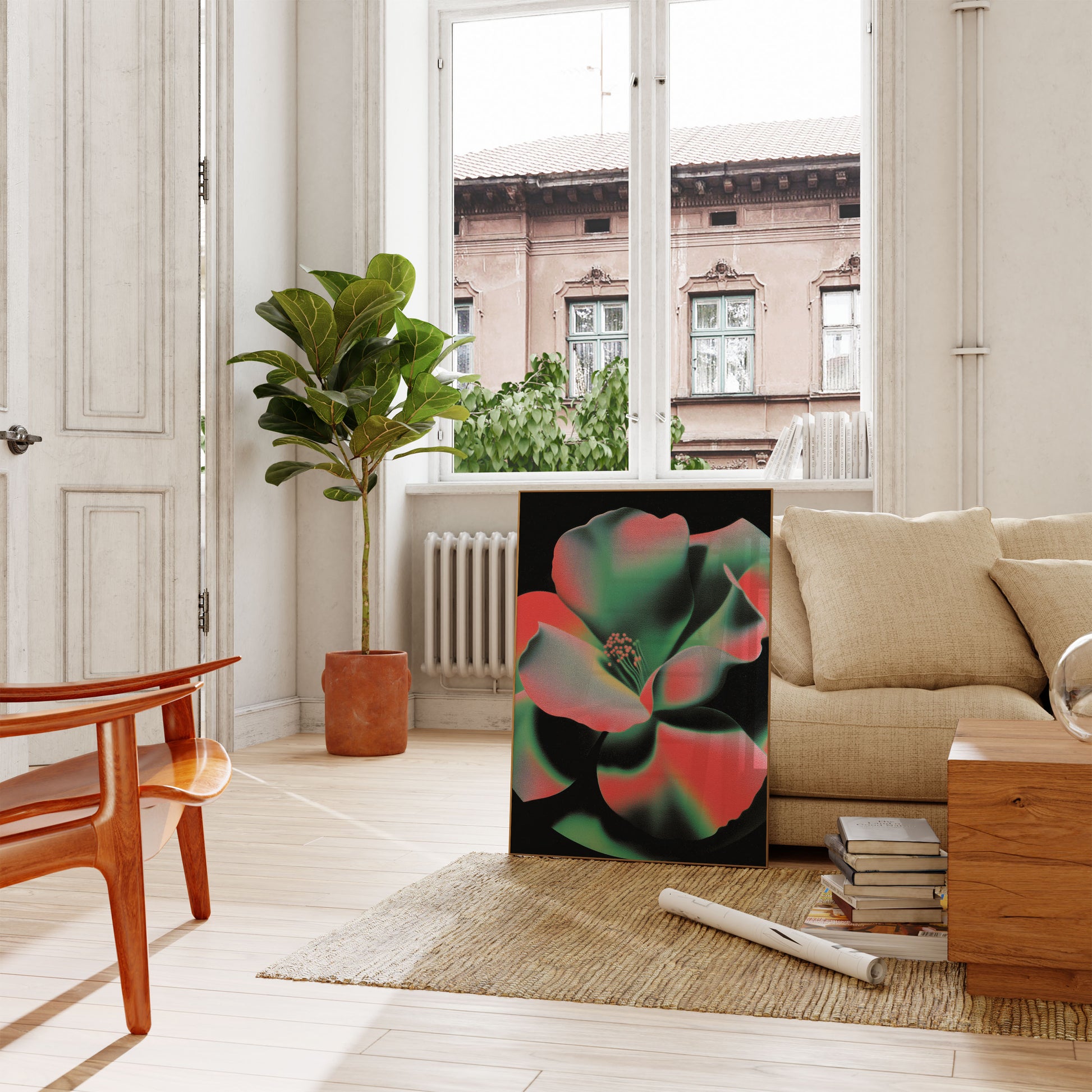 A mesmerizing floral artwork that blends vibrant coral and deep emerald green in a dreamy, soft-focus composition. The flower appears to pulse with an almost luminescent quality, creating a surreal and captivating visual experience that transforms traditional botanical imagery into a modern art piece.