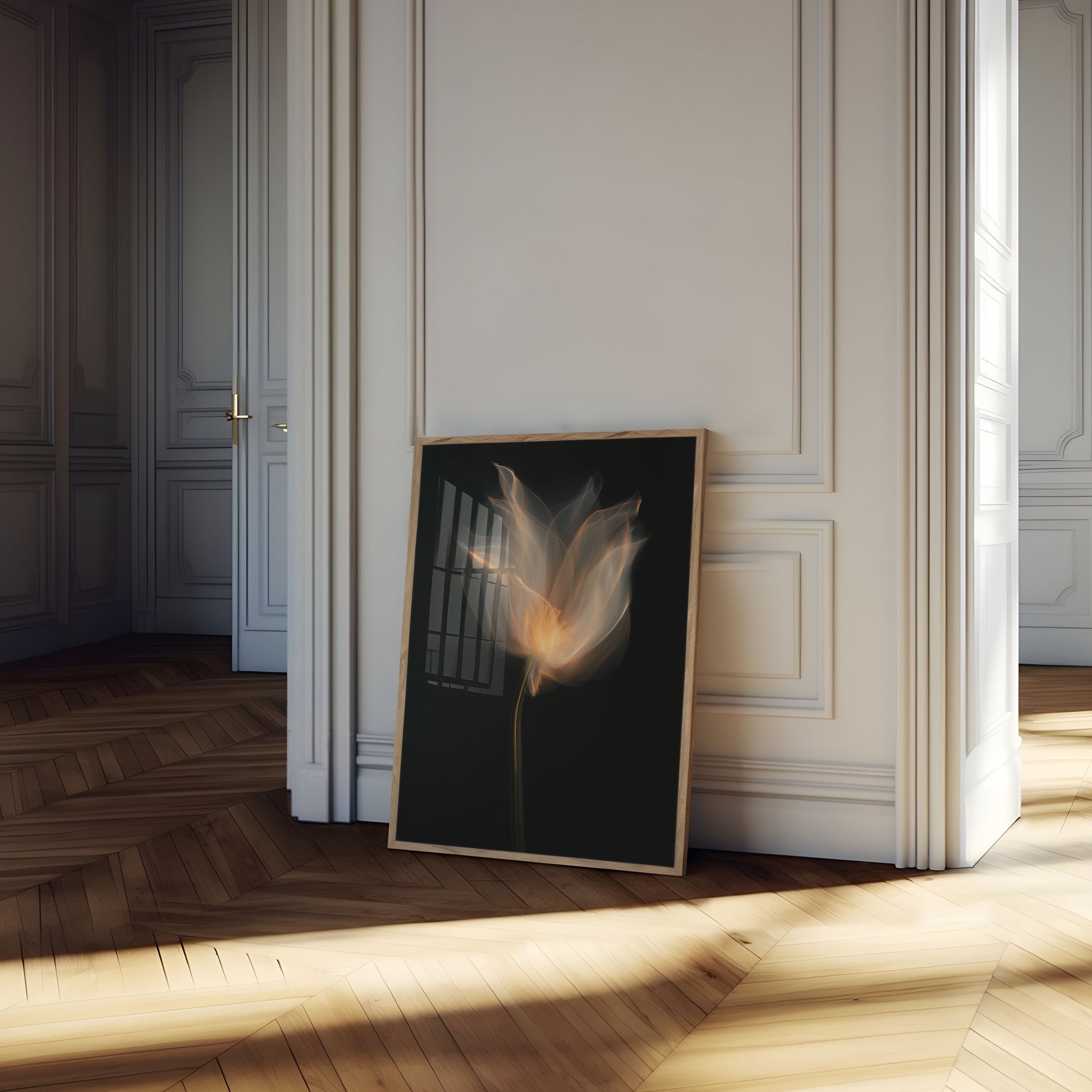 A breathtaking botanical artwork that captures a delicate flower in luminous, transparent layers. The image reveals soft, glowing petals in warm amber and misty white hues, seemingly floating against a deep black background. Each ethereal petal appears to be crafted from light itself, creating a mesmerizing and dreamlike botanical interpretation.