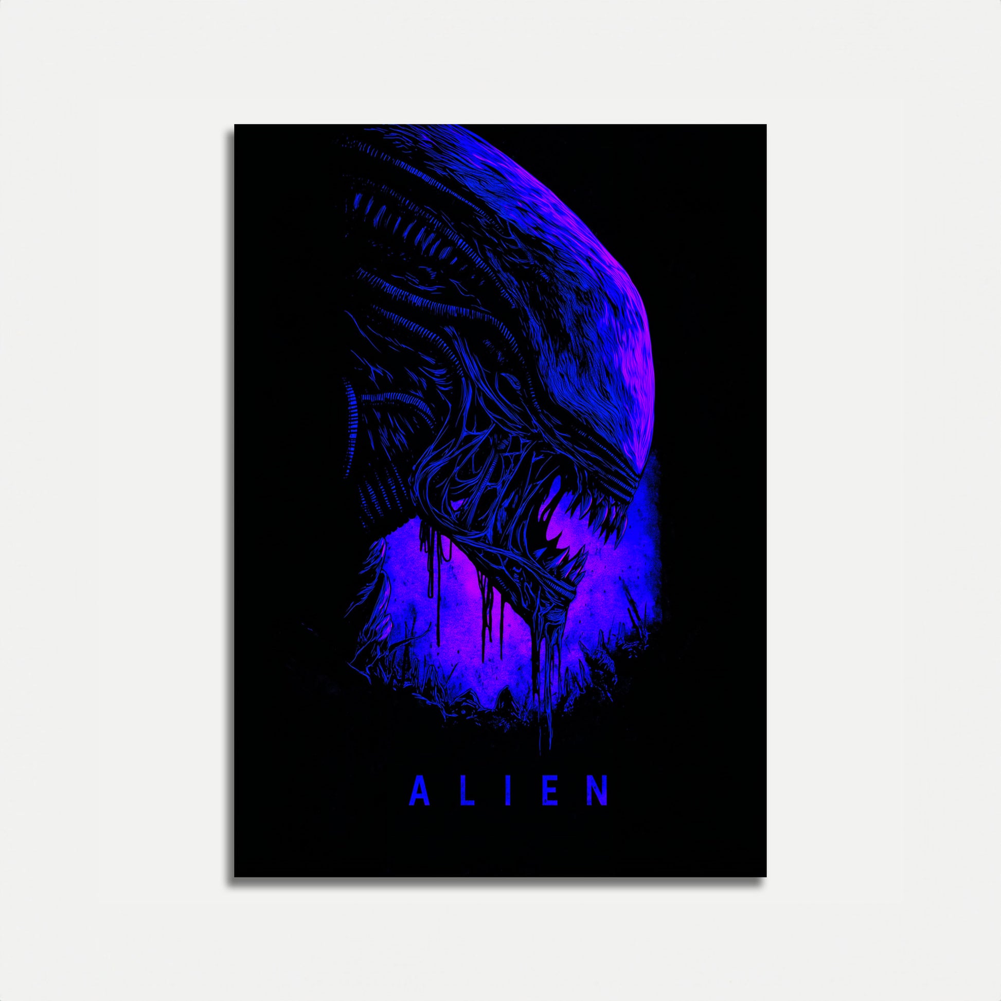 A haunting and biomechanical representation of an alien creature rendered in electrifying blue and purple hues. The design captures the menacing essence of a legendary sci-fi xenomorph, with intricate textural details and dripping, organic forms that suggest both terror and dark beauty.